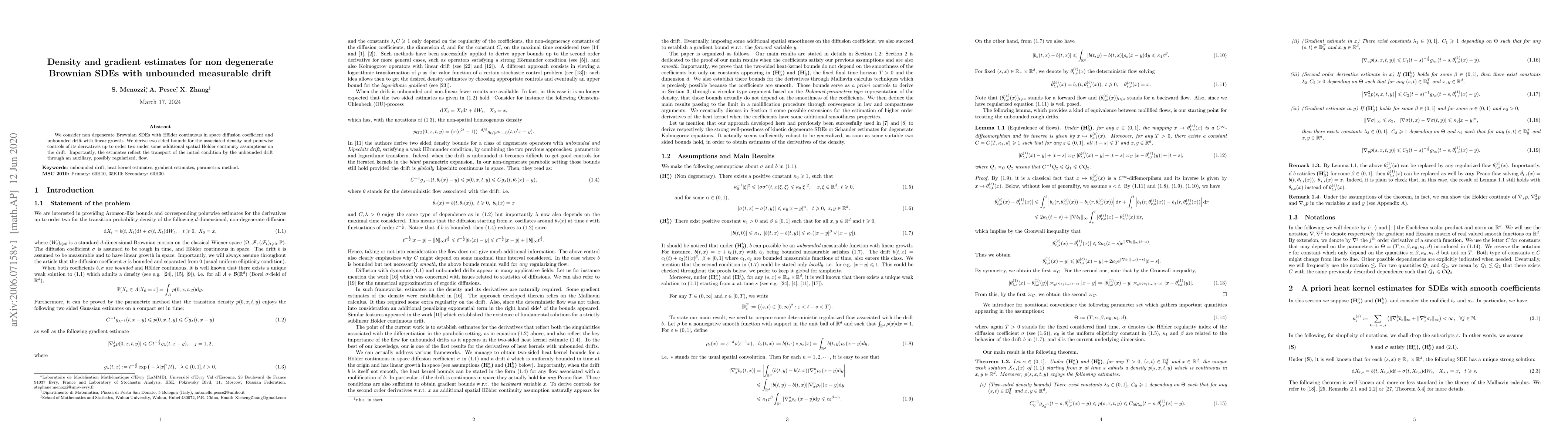 Summary: This paper provides density and gradient estimates for non-degenerate Brownian SDEs with unbounded drift and Hölder continuous diffusion coefficients, establishing two-sided bounds and derivative controls under spatial Hölder continuity assumptions, highlighting the drift's transport effect via an auxiliary flow.