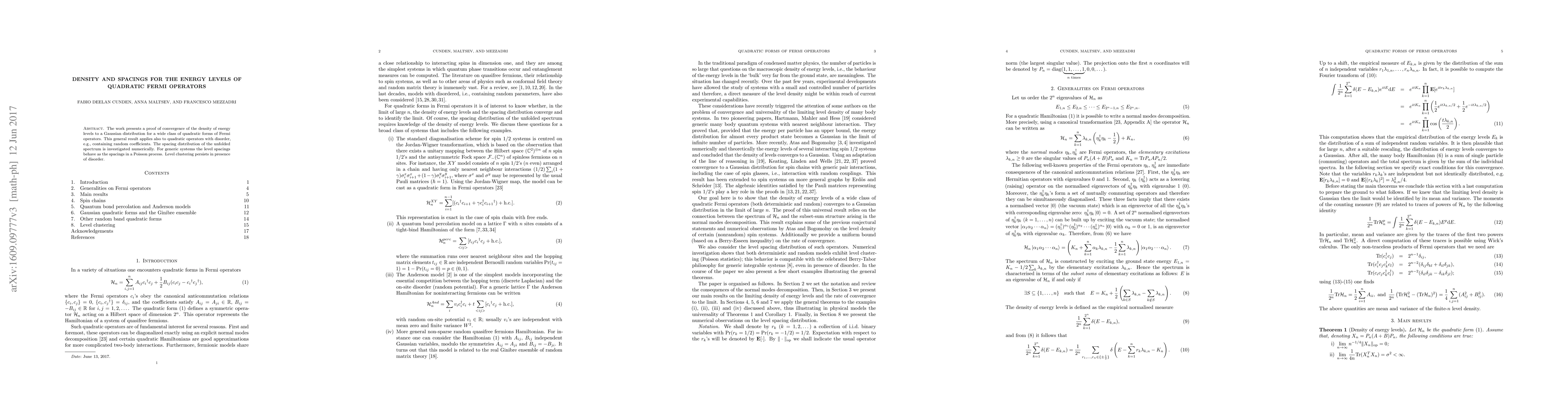 Research proves that energy levels of quadratic Fermi operators converge to a Gaussian distribution in many cases, including with disorder, while level spacings behave like a Poisson process.