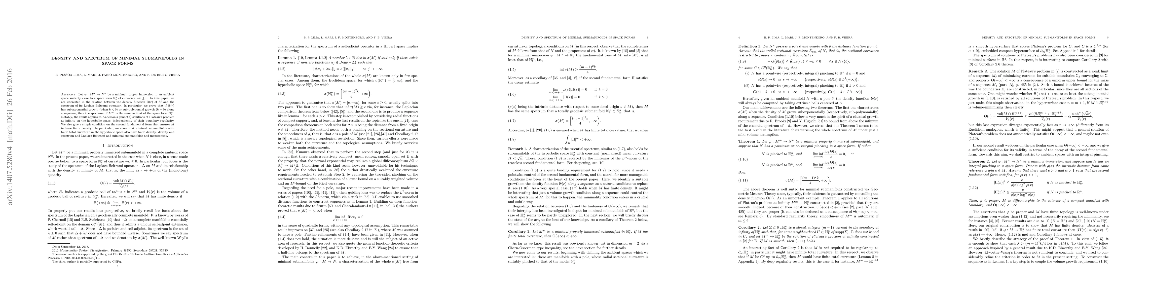 Let $M^m$ be a minimal properly immersed submanifold in an ambient space close, in a suitable sense, to the space form $\mathbb{N}^n_k$ of curvature $-k\le 0$. In this paper, we are interested in the relation between the density function $\Theta(r)$ of $M^m$ and the spectrum of the Laplace-Beltrami operator. In particular, we prove that if $\Theta(r)$ has subexponential growth (when $k<0$) or sub-polynomial growth ($k=0$) along a sequence, then the spectrum of $M^m$ is the same as that of the space form $\mathbb{N}^m_k$. Notably, the result applies to Anderson's (smooth) solutions of Plateau's problem at infinity on the hyperbolic space $\mathbb{H}^n$, independently of their boundary regularity. We also give a simple condition on the second fundamental form that ensures $M$ to have finite density. In particular, we show that minimal submanifolds of $\mathbb{H}^n$ with finite total curvature have finite density.