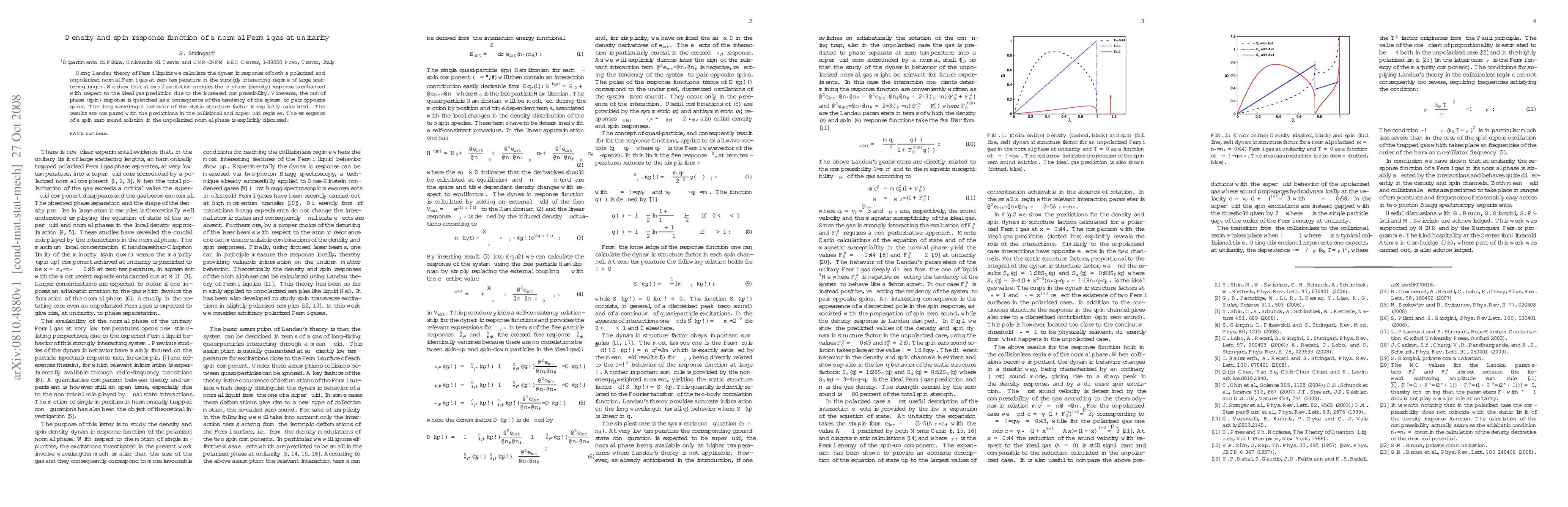 This paper calculates the dynamic density and spin response functions for a strongly interacting Fermi gas at unitarity using Landau theory, showing enhanced density response and quenched spin response due to increased compressibility and spin pairing tendencies, respectively. The study also discusses the emergence of a spin zero sound mode in the unpolarized phase.