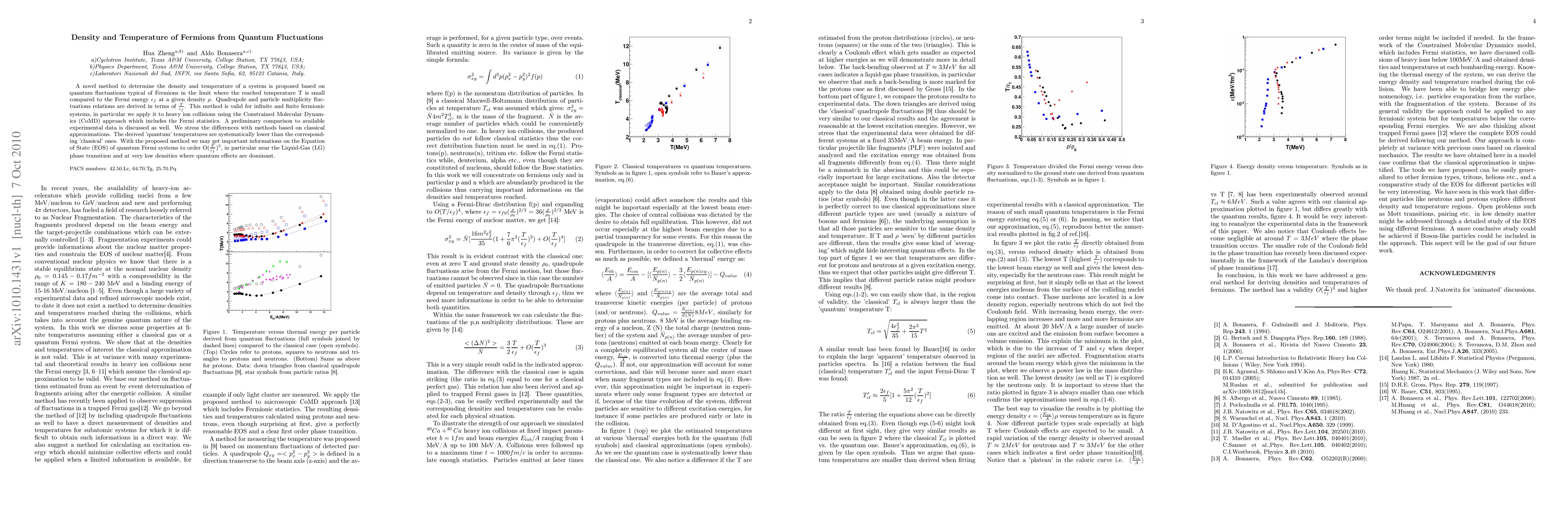 A novel method to determine the density and temperature of a system is proposed based on quantum fluctuations typical of Fermions in the limit where the reached temperature T is small compared to the Fermi energy $\epsilon_f$ at a given density $\rho$. Quadrupole and particle multiplicity fluctuations relations are derived in terms of $\frac{T}{\epsilon_f}$. This method is valid for infinite and finite fermionic systems, in particular we apply it to heavy ion collisions using the Constrained Molecular Dynamics (CoMD) approach which includes the Fermi statistics. A preliminary comparison to available experimental data is discussed as well. We stress the differences with methods based on classical approximations. The derived 'quantum' temperatures are systematically lower than the corresponding 'classical' ones. With the proposed method we may get important informations on the Equation of State (EOS) of quantum Fermi systems to order O($\frac{T}{\epsilon_f})^3$, in particular near the Liquid-Gas (LG) phase transition and at very low densities where quantum effects are dominant.
