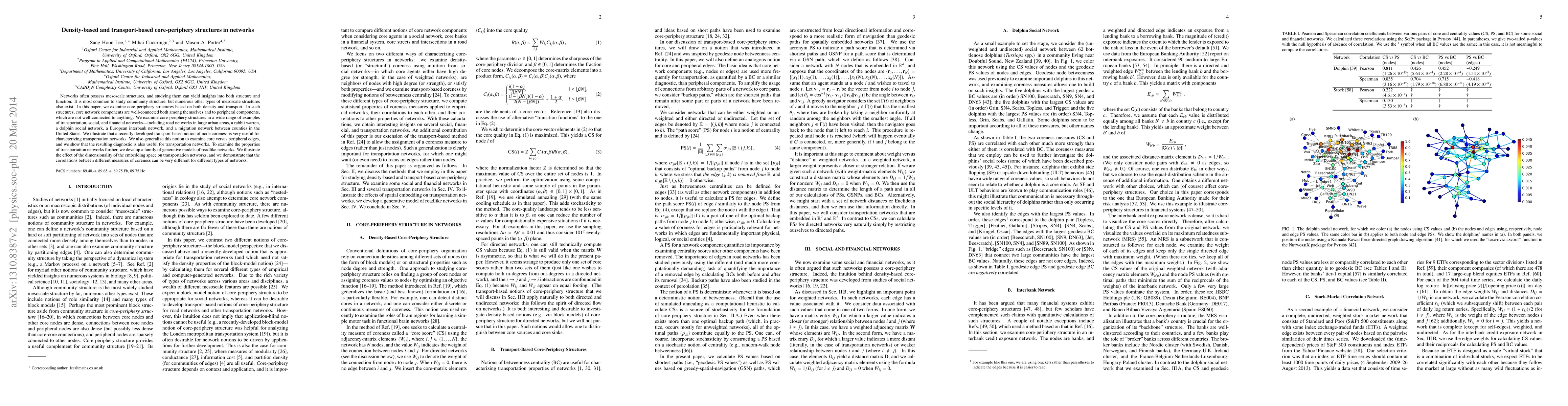 Researchers studied core-periphery structures in various types of networks, including transportation, social, and financial networks, highlighting the usefulness of a new transport-based notion of node coreness for characterizing transportation networks.
