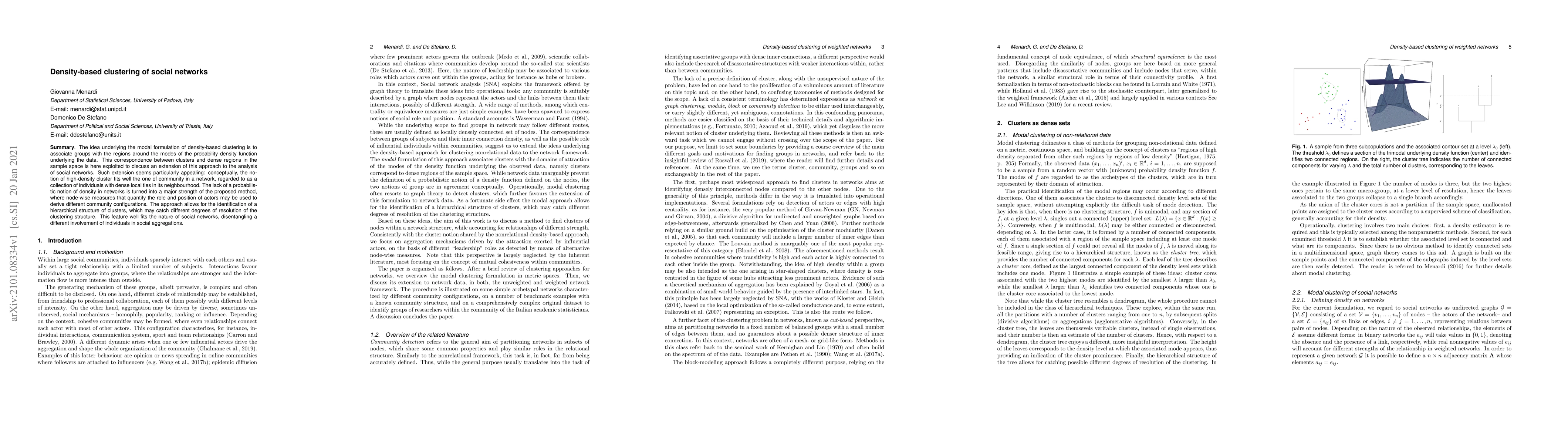 This paper proposes a density-based clustering method for social networks, associating clusters with dense regions around data modes. It leverages node-wise measures to identify hierarchical community structures, capturing varying levels of individual involvement in social aggregations.