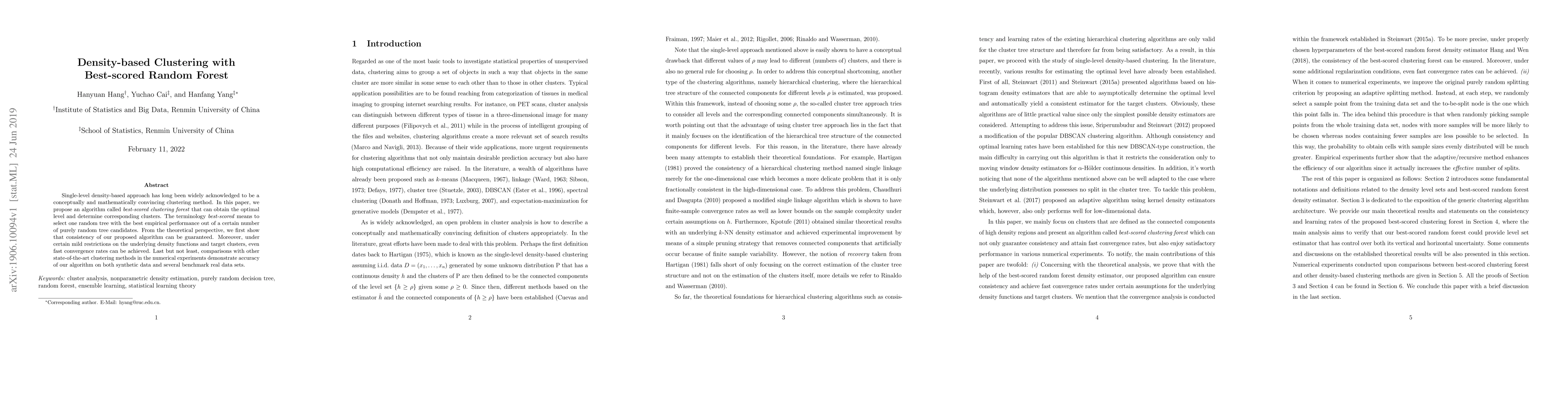 This paper proposes a "best-scored clustering forest" algorithm that leverages density-based clustering and a Random Forest to determine optimal clustering levels and clusters. The method selects the best-performing random tree from several candidates, demonstrating theoretical consistency and fast convergence under certain conditions. Experimental results show superior accuracy compared to other clustering methods on both synthetic and real datasets.
