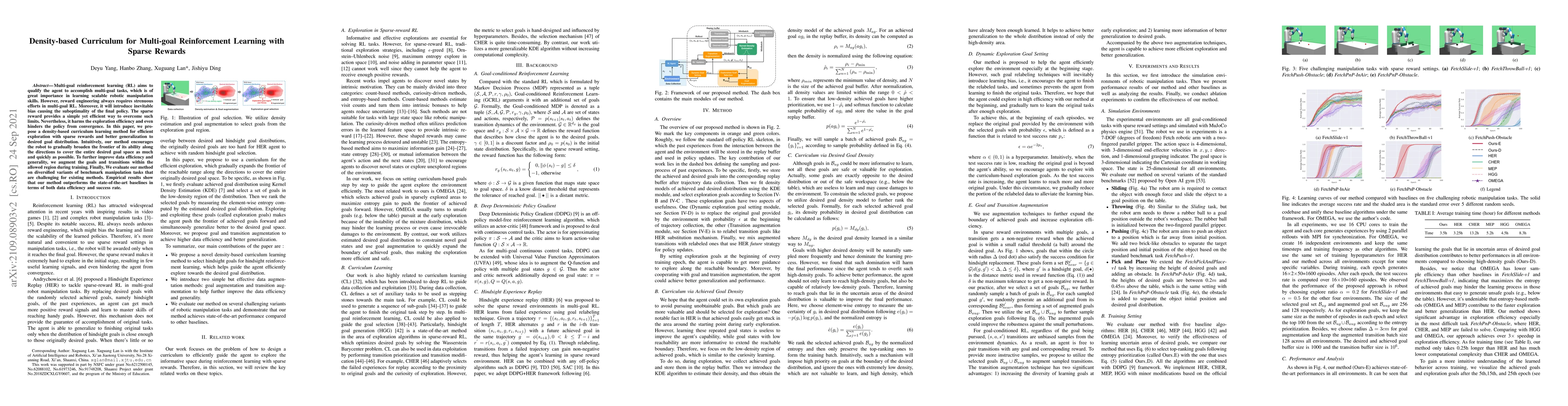 This paper proposes a density-based curriculum learning method to enhance exploration efficiency and generalization in multi-goal reinforcement learning with sparse rewards. It achieves better data efficiency and success rate compared to state-of-the-art baselines in benchmark manipulation tasks.
