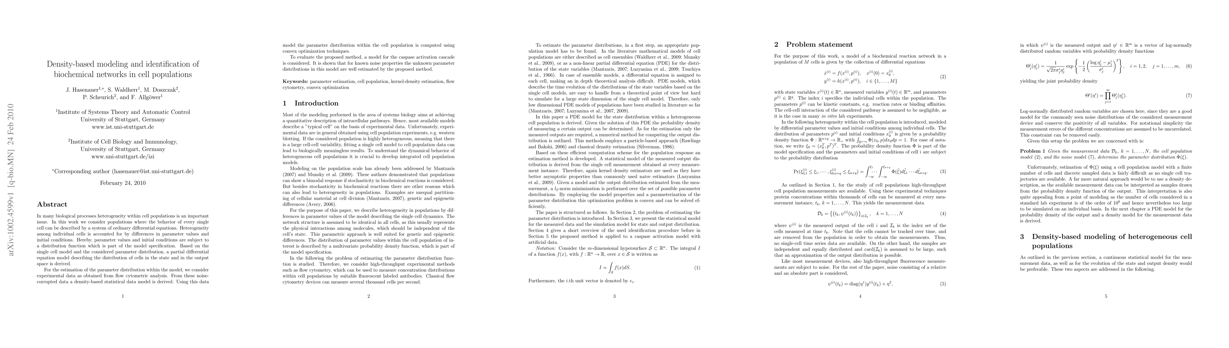 In many biological processes heterogeneity within cell populations is an important issue. In this work we consider populations where the behavior of every single cell can be described by a system of ordinary differential equations. Heterogeneity among individual cells is accounted for by differences in parameter values and initial conditions. Hereby, parameter values and initial conditions are subject to a distribution function which is part of the model specification. Based on the single cell model and the considered parameter distribution, a partial differential equation model describing the distribution of cells in the state and in the output space is derived. For the estimation of the parameter distribution within the model, we consider experimental data as obtained from flow cytometric analysis. From these noise-corrupted data a density-based statistical data model is derived. Using this data model the parameter distribution within the cell population is computed using convex optimization techniques. To evaluate the proposed method, a model for the caspase activation cascade is considered. It is shown that for known noise properties the unknown parameter distributions in this model are well estimated by the proposed method.