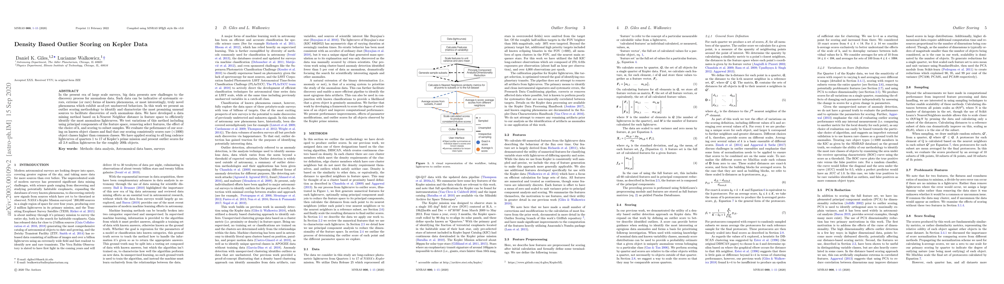 In the present era of large scale surveys, big data presents new challenges to the discovery process for anomalous data. Such data can be indicative of systematic errors, extreme (or rare) forms of known phenomena, or most interestingly, truly novel phenomena which exhibit as-of-yet unobserved behaviors. In this work we present an outlier scoring methodology to identify and characterize the most promising unusual sources to facilitate discoveries of such anomalous data. We have developed a data mining method based on k-Nearest Neighbor distance in feature space to efficiently identify the most anomalous lightcurves. We test variations of this method including using principal components of the feature space, removing select features, the effect of the choice of k, and scoring to subset samples. We evaluate the peformance of our scoring on known object classes and find that our scoring consistently scores rare (<1000) object classes higher than common classes. We have applied scoring to all long cadence lightcurves of quarters 1 to 17 of Kepler's prime mission and present outlier scores for all 2.8 million lightcurves for the roughly 200k objects.
