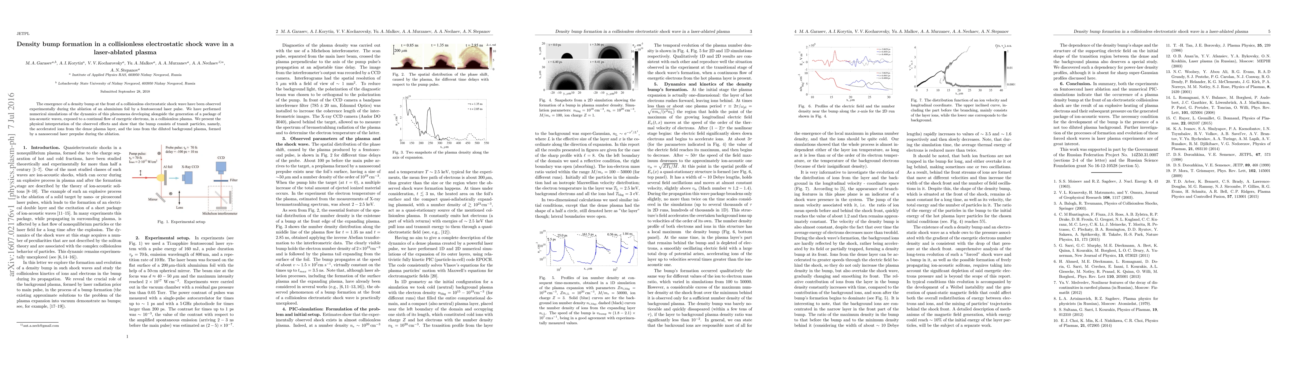 The emergence of a density bump at the front of a collisionless electrostatic shock wave have been observed experimentally during the ablation of an aluminium foil by a femtosecond laser pulse. We have performed numerical simulations of the dynamics of this phenomena developing alongside the generation of a package of ion-acoustic waves, exposed to a continual flow of energetic electrons, in a collisionless plasma. We present the physical interpretation of the observed effects and show that the bump consists of transit particles, namely, the accelerated ions from the dense plasma layer, and the ions from the diluted background plasma, formed by a nanosecond laser prepulse during the ablation.