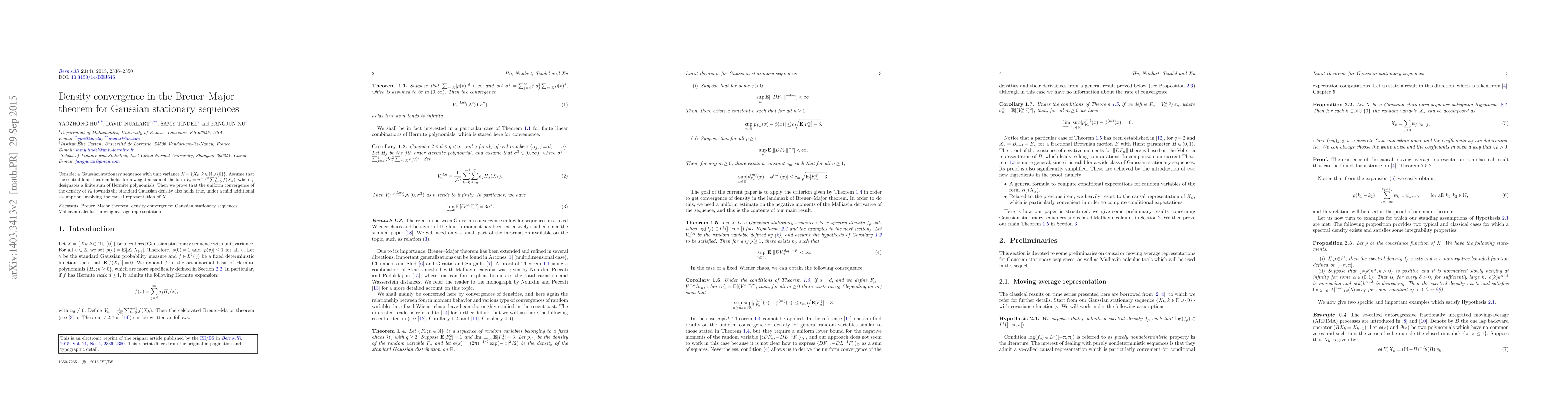 Consider a Gaussian stationary sequence with unit variance $X=\{X_k;k\in {\mathbb{N}}\cup\{0\}\}$. Assume that the central limit theorem holds for a weighted sum of the form $V_n=n^{-1/2}\sum^{n-1}_{k=0}f(X_k)$, where $f$ designates a finite sum of Hermite polynomials. Then we prove that the uniform convergence of the density of $V_n$ towards the standard Gaussian density also holds true, under a mild additional assumption involving the causal representation of $X$.