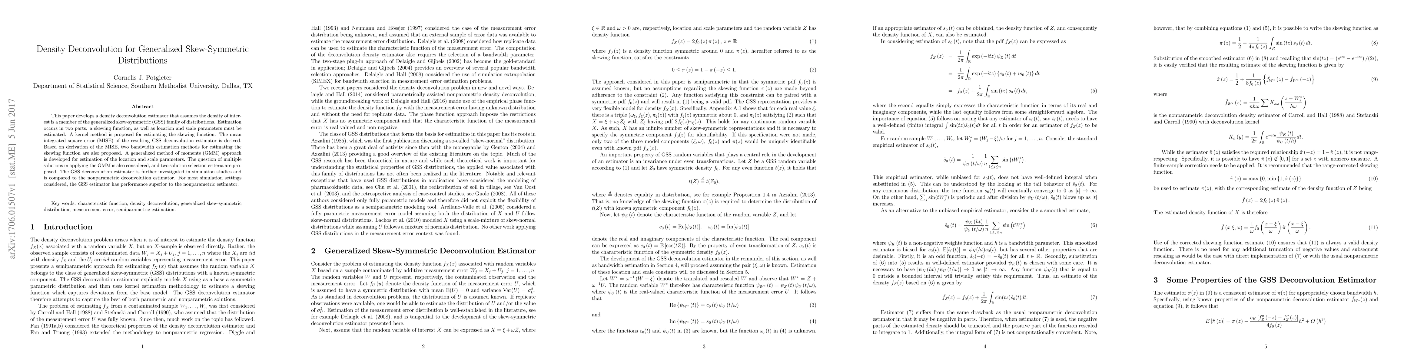 This paper proposes a density deconvolution estimator for generalized skew-symmetric distributions, employing a kernel method for the skewing function and a GMM approach for location and scale parameters. Simulation studies show superior performance of the GSS estimator compared to nonparametric methods.