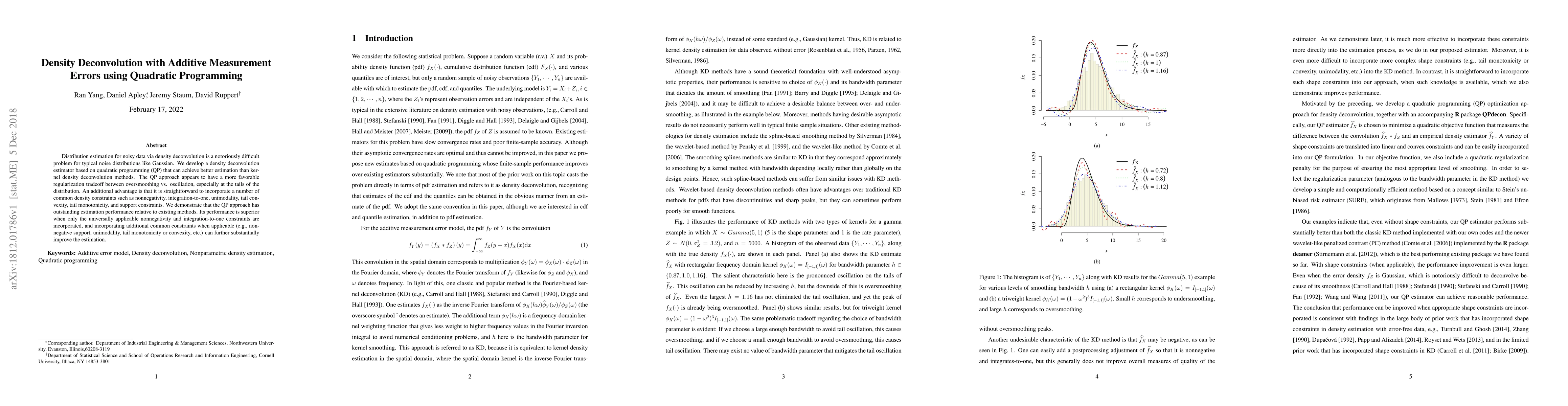 This paper proposes a density deconvolution method using quadratic programming to achieve better estimation than kernel-based methods, especially for noisy data. The QP approach effectively balances regularization and can incorporate various density constraints, leading to superior performance, particularly when nonnegativity and integration-to-one constraints are applied.