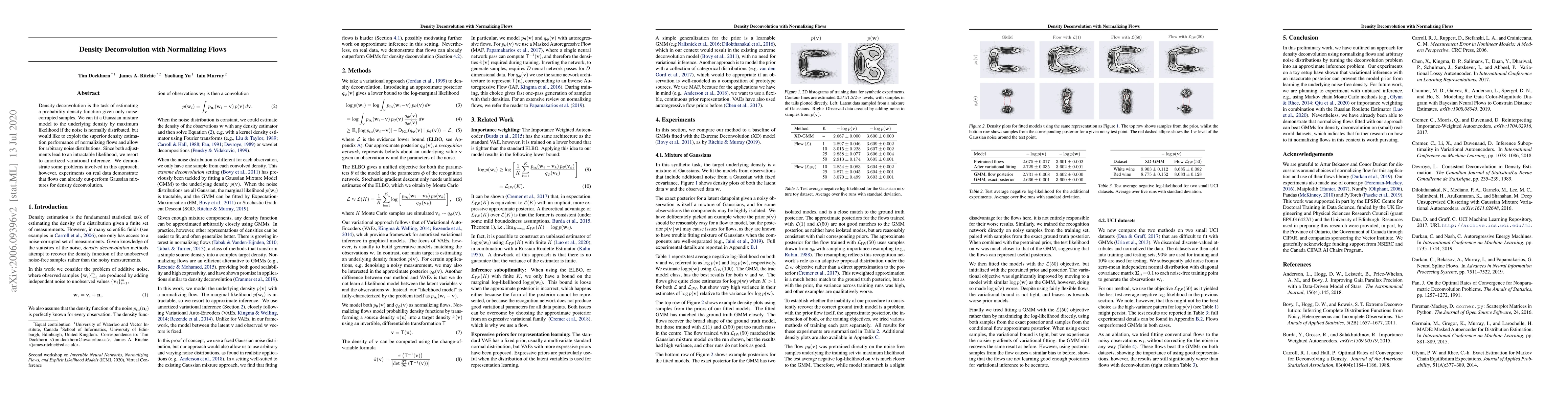 This paper explores density deconvolution using normalizing flows to estimate probability density functions from noise-corrupted samples, demonstrating that they outperform Gaussian mixture models, even when the noise distribution is arbitrary. The study employs amortized variational inference to address the intractable likelihood problem.