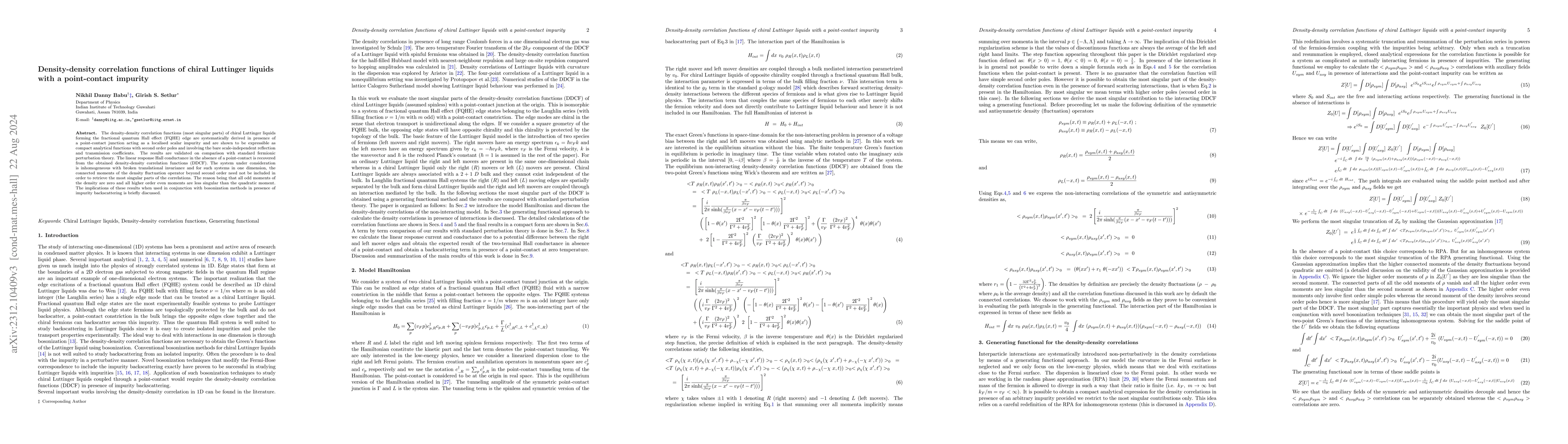 This research systematically derives the density density correlation functions for chiral Luttinger liquids with a point-contact impurity, showing analytical results with second-order poles. The findings recover the linear response Hall conductance and validate against fermionic perturbation theory, while noting that higher-order density moments beyond second order are not necessary for singular correlation retrieval.