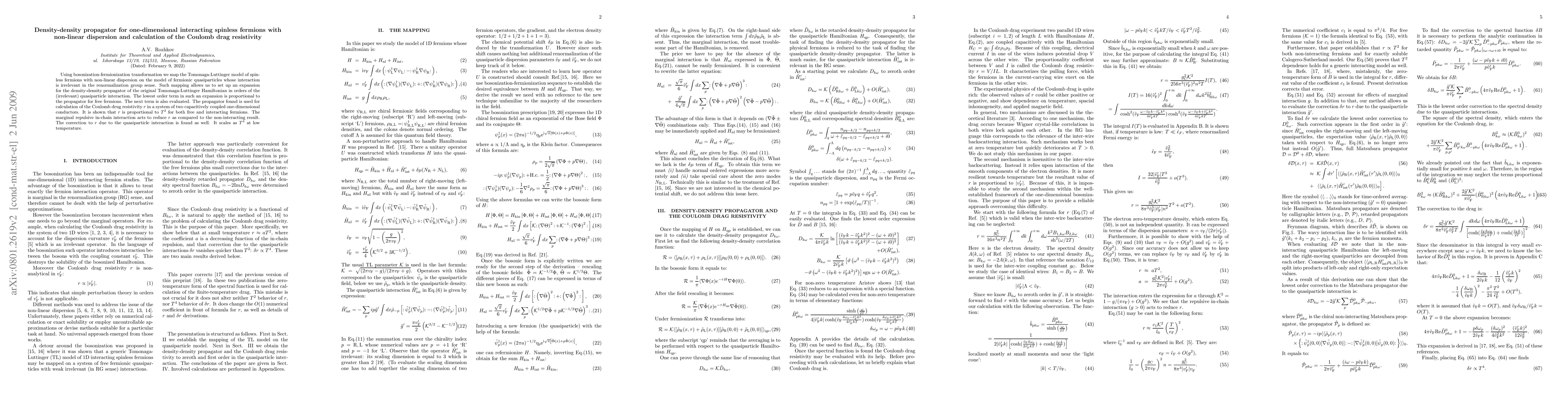 Using bosonization-fermionization transformation we map the Tomonaga-Luttinger model of spinless fermions with non-linear dispersion on the model of fermionic quasiparticles whose interaction is irrelevant in the renormalization group sense. Such mapping allows us to set up an expansion for the density-density propagator of the original Tomonaga-Luttinger Hamiltonian in orders of the (irrelevant) quasiparticle interaction. The lowest order term in such an expansion is proportional to the propagator for free fermions. The next term is also evaluated. The propagator found is used for calculation of the Coulomb drug resistivity $r$ in a system of two capacitively coupled one-dimensional conductors. It is shown that $r$ is proportional to $T^2$ for both free and interacting fermions. The marginal repulsive in-chain interaction acts to reduce $r$ as compared to the non-interacting result. The correction to $r$ due to the quasiparticle interaction is found as well. It scales as $T^4$ at low temperature.