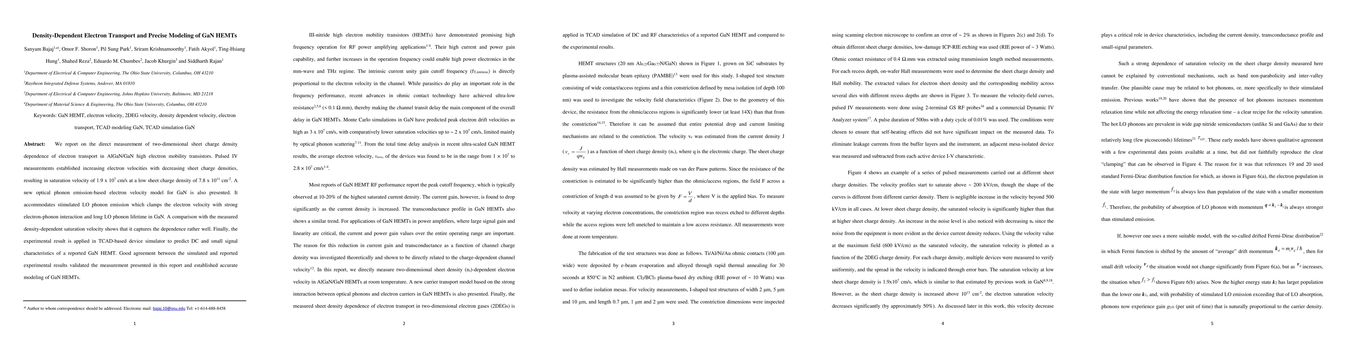 This paper presents direct measurements of electron transport in AlGaN/GaN HEMTs, showing increased electron velocities with decreasing sheet charge density, and introduces a new electron velocity model that accurately captures these effects. The model is validated through TCAD simulations, confirming precise modeling of GaN HEMTs.