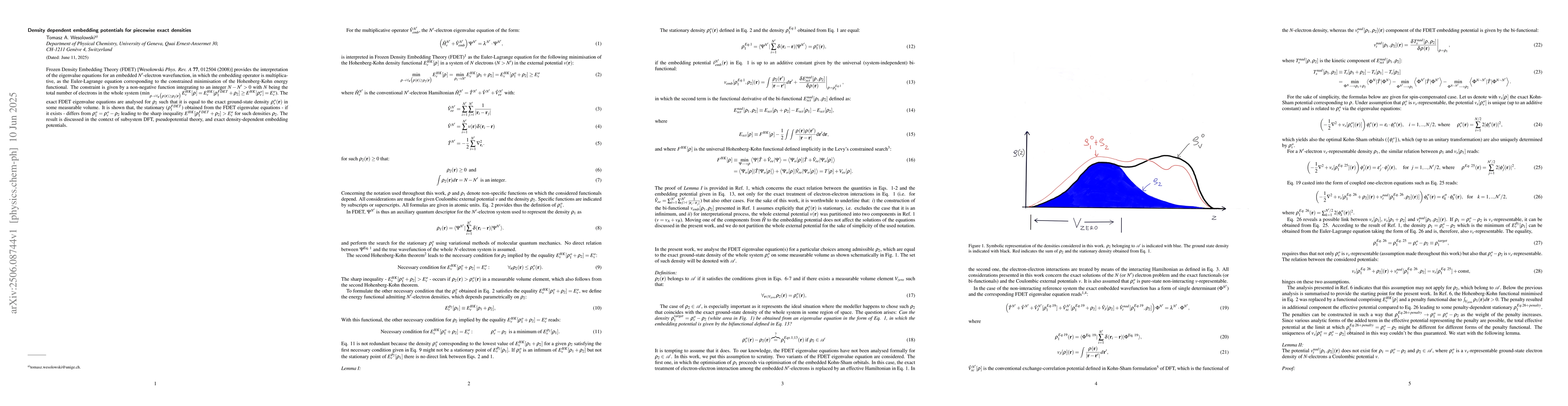 Frozen Density Embedding Theory (FDET) [Wesolowski {\it Phys. Rev. A} {\bf 77}, 012504 (2008)] provides the interpretation of the eigenvalue equations for an embedded $N'$-electron wavefunction, in which the embedding operator is multiplicative, as the Euler-Lagrange equation corresponding to the constrained minimisation of the Hohenberg-Kohn energy functional. The constraint is given by a non-negative function integrating to an integer $N-N'>0$ with $N$ being the total number of electrons in the whole system ($\min_{\rho\rightarrow\forall_{\mathbf{r}}\big(\rho({\mathbf r})\ge \rho_2({\mathbf r}\big)} E^{HK}_v[\rho]=E^{HK}_v[\rho_1^{FDET}+\rho_2]\ge E^{HK}[\rho_v^{o}]=E^o_v$). The exact FDET eigenvalue equations are analysed for $\rho_2$ such that it is equal to the exact ground-state density $\rho_v^{o}({\mathbf r})$ in some measurable volume. It is shown that, the stationary ($\rho_1^{FDET}$) obtained from the FDET eigenvalue equations - if it exists - differs from $\rho_1^o=\rho_v^{o}-\rho_2$ leading to the sharp inequality $E^{HK}[\rho_1^{FDET}+\rho_2]> E^o_v$ for such densities $\rho_2$. The result is discussed in the context of subsystem DFT, pseudopotential theory, and exact density-dependent embedding potentials.