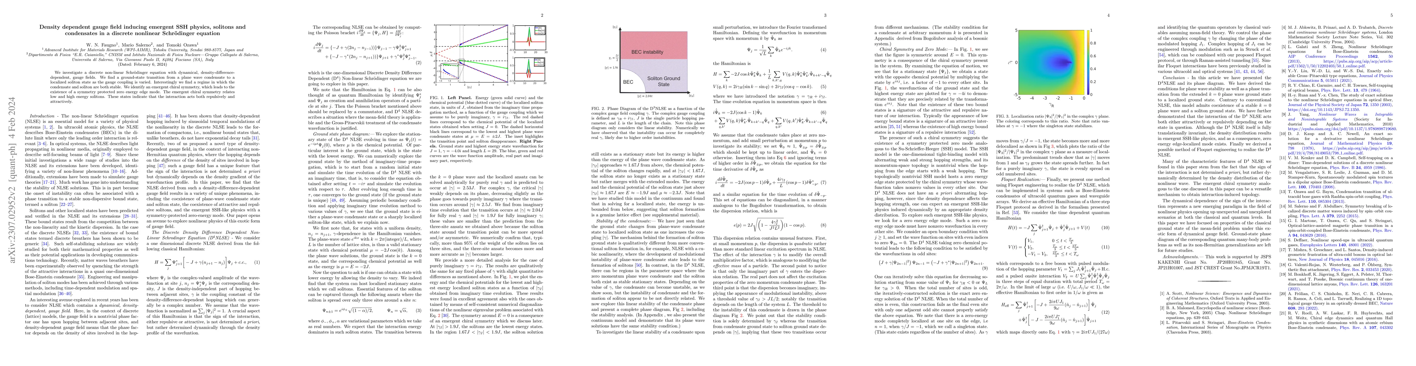 This paper explores a discrete nonlinear Schrödinger equation with density-dependent gauge fields, revealing a transition from plane wave condensates to soliton states. It identifies an emergent chiral symmetry leading to a zero-energy edge mode, indicating both repulsive and attractive interactions.