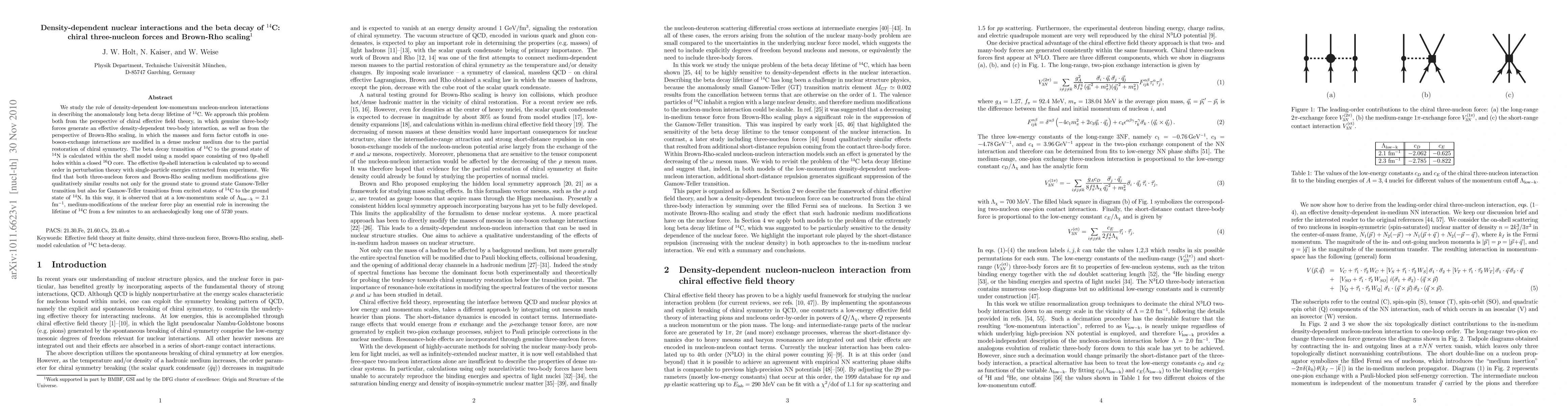 This paper investigates the impact of density-dependent nuclear interactions on the beta decay of 14C, using chiral effective field theory and Brown-Rho scaling. The study finds that both three-nucleon forces and medium modifications of nuclear forces significantly extend the decay lifetime of 14C to its archaeologically long observed value of 5730 years.