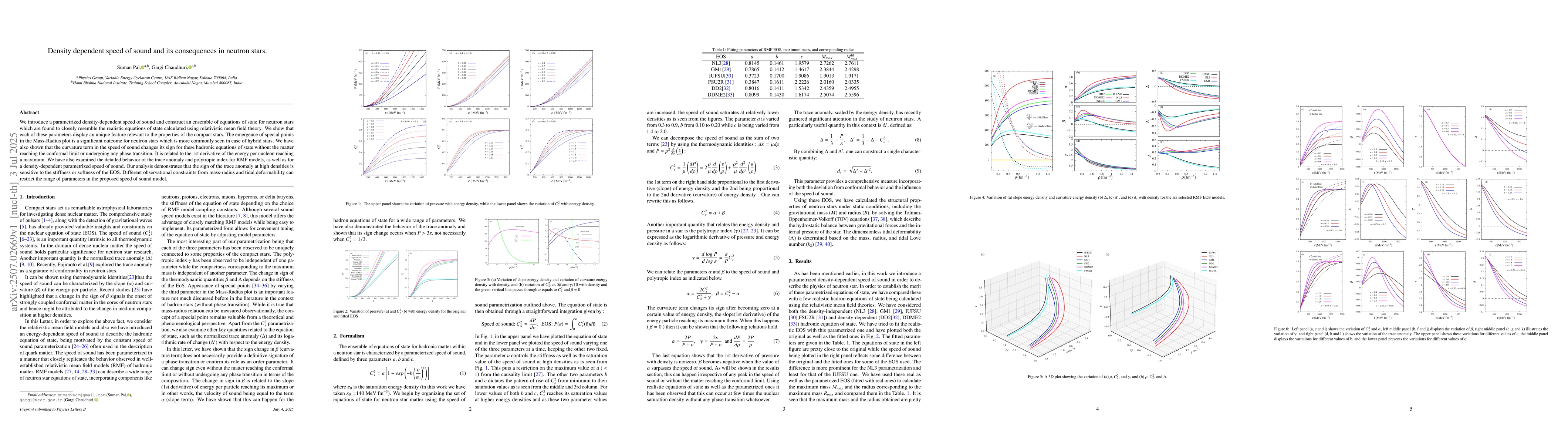 We introduce a parametrized density-dependent speed of sound and construct an ensemble of equations of state for neutron stars which are found to closely resemble the realistic equations of state calculated using relativistic mean field theory. We show that each of these parameters display an unique feature relevant to the properties of the compact stars. The emergence of special points in the Mass-Radius plot is a significant outcome for neutron stars which is more commonly seen in case of hybrid stars. We have also shown that the curvature term in the speed of sound changes its sign for these hadronic equations of state without the matter reaching the conformal limit or undergoing any phase transition. It is related to the 1st derivative of the energy per nucleon reaching a maximum. We have also examined the detailed behavior of the trace anomaly and polytropic index for RMF models, as well as for a density-dependent parametrized speed of sound. Our analysis demonstrates that the sign of the trace anomaly at high densities is sensitive to the stiffness or softness of the EOS. Different observational constraints from mass-radius and tidal deformability can restrict the range of parameters in the proposed speed of sound model.
