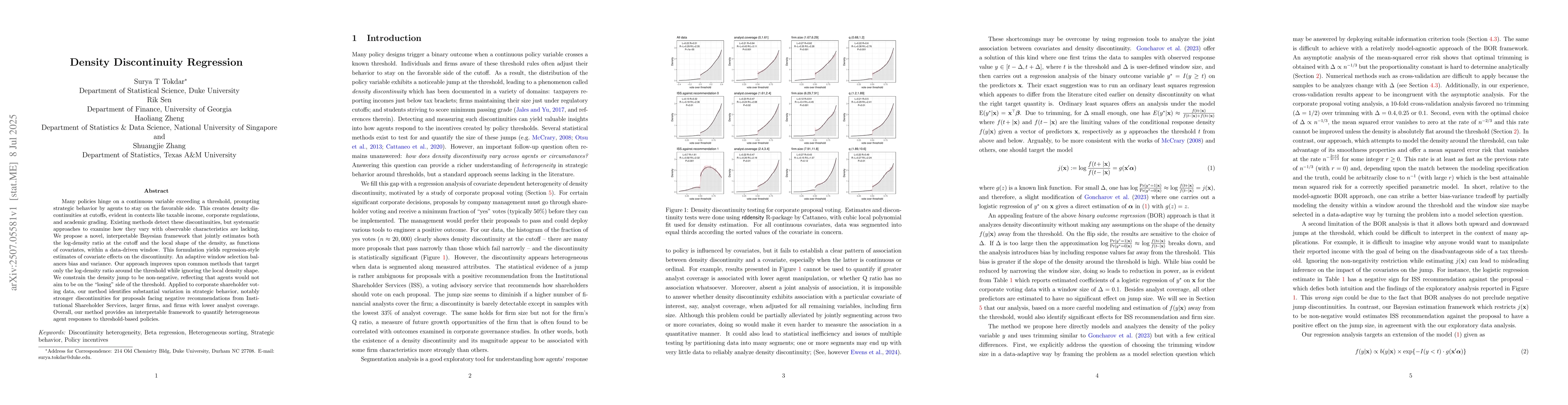 Many policies hinge on a continuous variable exceeding a threshold, prompting strategic behavior by agents to stay on the favorable side. This creates density discontinuities at cutoffs, evident in contexts like taxable income, corporate regulations, and academic grading. Existing methods detect these discontinuities, but systematic approaches to examine how they vary with observable characteristics are lacking. We propose a novel, interpretable Bayesian framework that jointly estimates both the log-density ratio at the cutoff and the local shape of the density, as functions of covariates, within a data-driven window. This formulation yields regression-style estimates of covariate effects on the discontinuity. An adaptive window selection balances bias and variance. Our approach improves upon common methods that target only the log-density ratio around the threshold while ignoring the local density shape. We constrain the density jump to be non-negative, reflecting that agents would not aim to be on the losing side of the threshold. Applied to corporate shareholder voting data, our method identifies substantial variation in strategic behavior, notably stronger discontinuities for proposals facing negative recommendations from Institutional Shareholder Services, larger firms, and firms with lower analyst coverage. Overall, our method provides an interpretable framework to quantify heterogeneous agent responses to threshold-based policies.