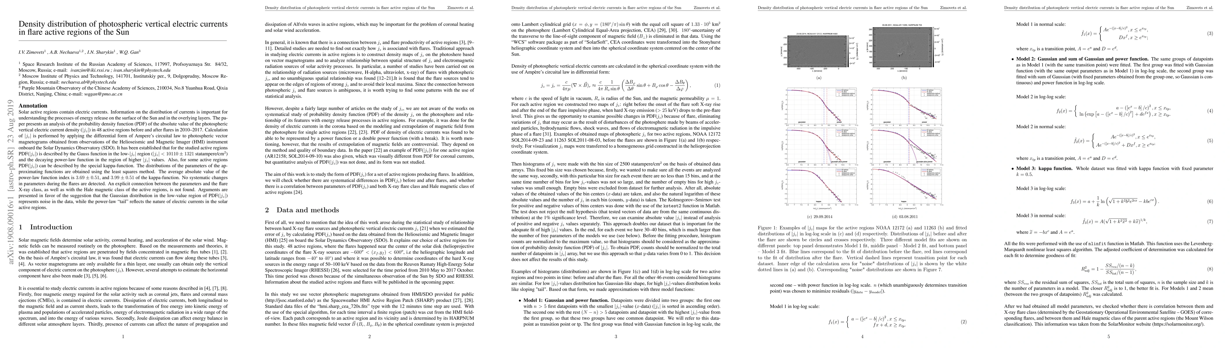 This paper analyzes the probability density function of photospheric vertical electric current density in solar active regions, revealing a Gaussian distribution for low values and a decaying power-law for higher values, with no systematic changes during flares. The study suggests that the Gaussian distribution may represent noise, while the power-law tail indicates the true nature of electric currents.