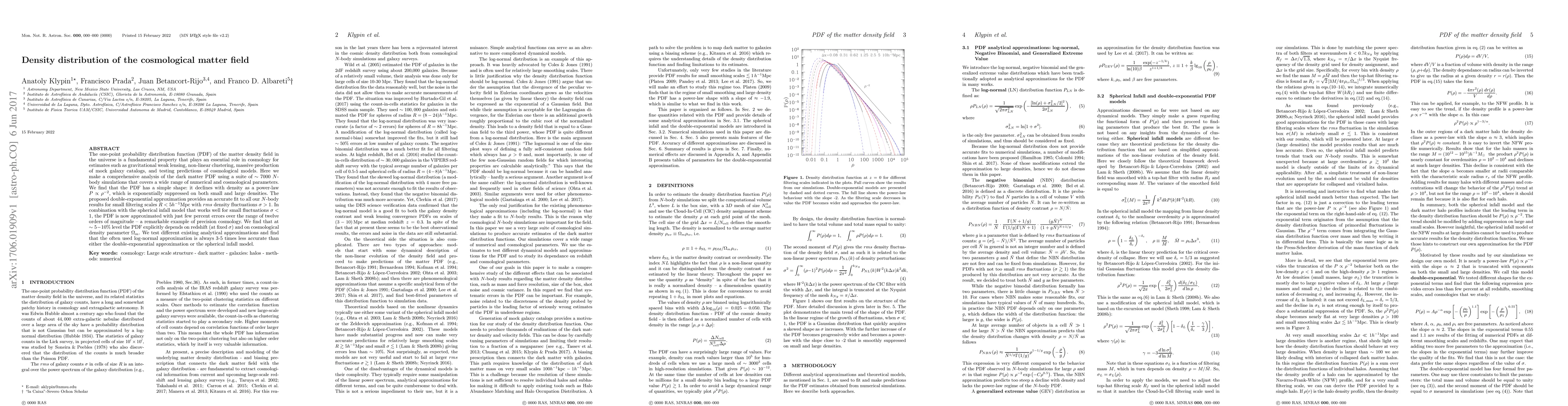 This paper analyzes the one-point probability distribution function (PDF) of the matter density field in the universe using 7000 N-body simulations. It finds that the PDF follows a power-law decline and is exponentially suppressed at both extremes, best approximated by a double-exponential model for small scales.
