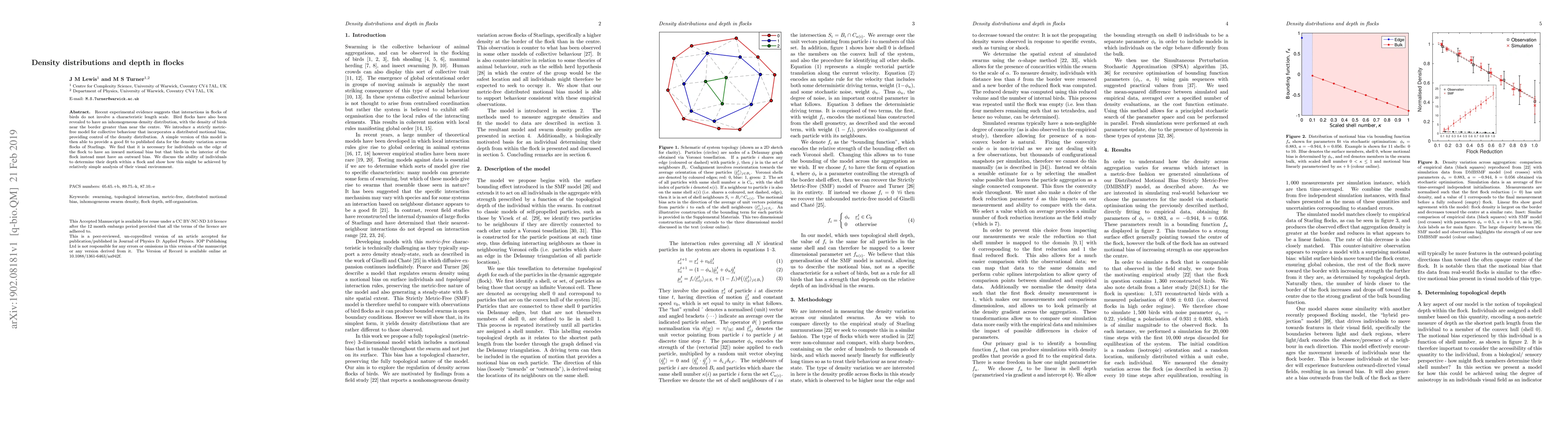 Recent experimental evidence suggests that interactions in flocks of birds do not involve a characteristic length scale. Bird flocks have also been revealed to have an inhomogeneous density distribution, with the density of birds near the border greater than near the centre. We introduce a strictly metric-free model for collective behaviour that incorporates a distributed motional bias, providing control of the density distribution. A simple version of this model is then able to provide a good fit to published data for the density variation across flocks of Starlings. We find that it is necessary for individuals on the edge of the flock to have an inward motional bias but that birds in the interior of the flock instead must have an outward bias. We discuss the ability of individuals to determine their depth within a flock and show how this might be achieved by relatively simple analysis of their visual environment.