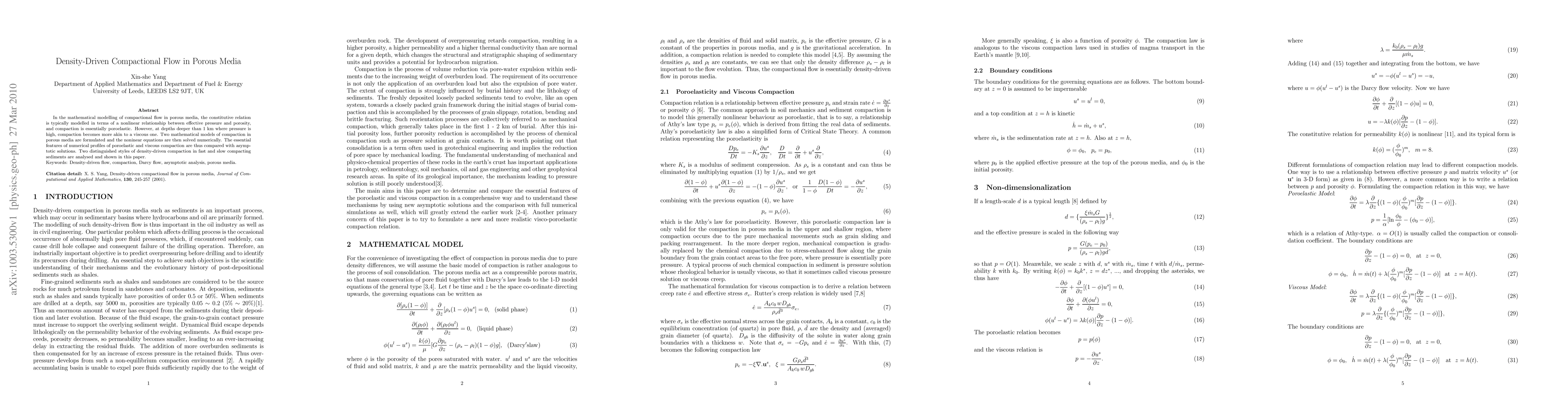 In the mathematical modelling of compactional flow in porous media, the constitutive relation is typically modelled in terms of a nonlinear relationship between effective pressure and porosity, and compaction is essentially poroelastic. However, at depths deeper than 1 km where pressure is high, compaction becomes more akin to a viscous one. Two mathematical models of compaction in porous media are formulated and the noninear equations are then solved numerically. The essential features of numerical profiles of poroelastic and viscous compaction are thus compared with asymptotic solutions. Two distinguished styles of density-driven compaction in fast and slow compacting sediments are analysed and shown in this paper.