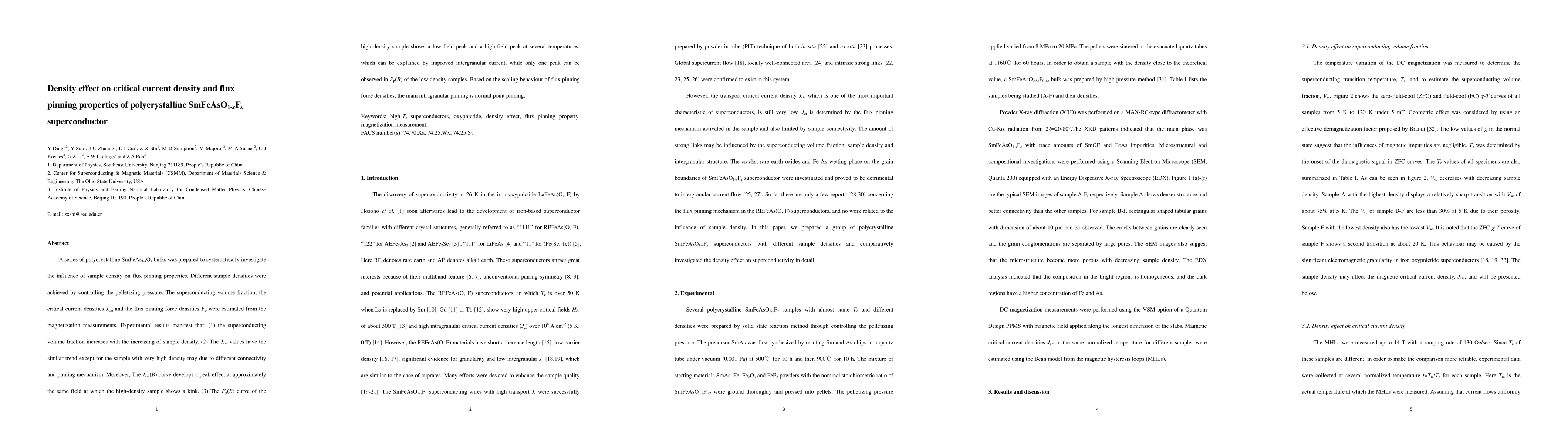 This study examines the impact of sample density on the superconducting properties of SmFeAsO1-xFx. Key findings include a decrease in superconducting volume fraction with lower density, similar trends in critical current densities (with a peak effect at a consistent field), and distinct flux pinning force density behaviors (high-density samples show two peaks, low-density samples show one). The research suggests that intragranular pinning is primarily via normal point pinning.