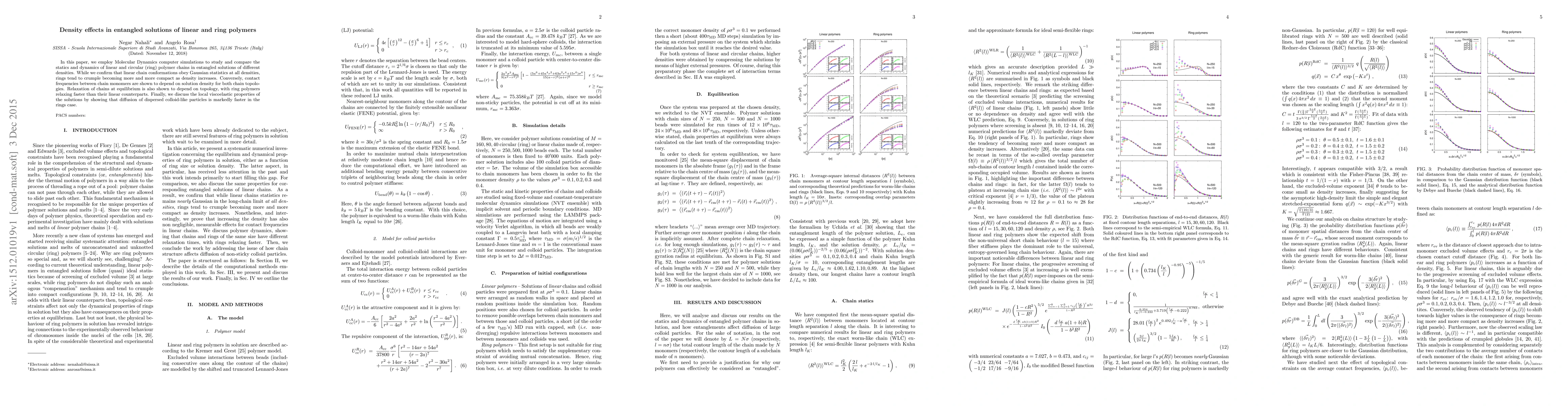 This paper uses Molecular Dynamics simulations to compare linear and ring polymer chains in entangled solutions at varying densities, finding that rings become more compact with increased density while linear chains follow Gaussian statistics. Ring polymers exhibit faster relaxation and higher contact frequencies than linear chains, with diffusion of particles being faster in ring polymer solutions.