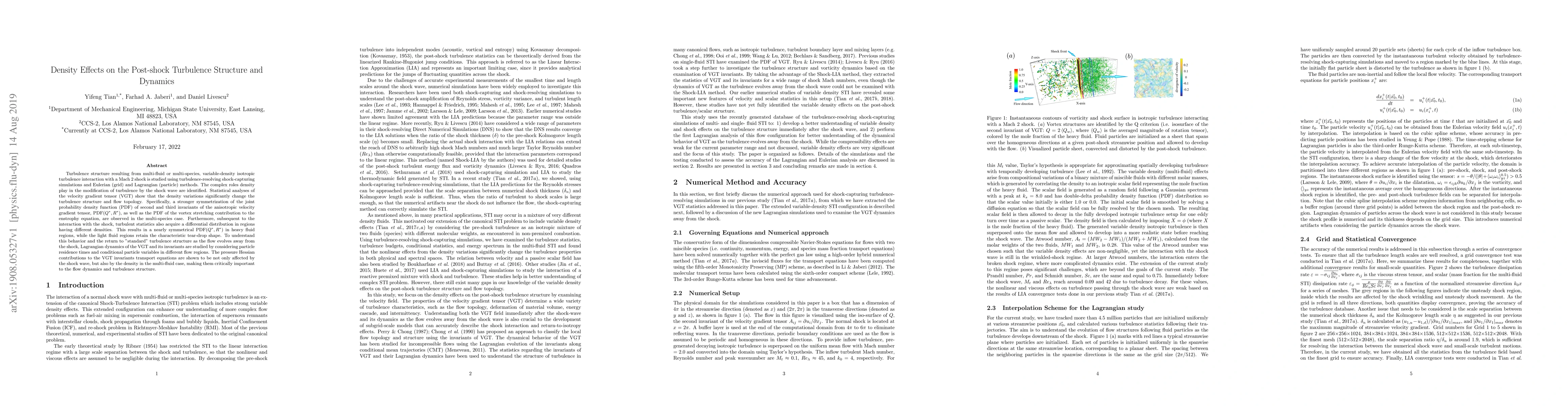 This paper investigates how density variations influence turbulence structure and dynamics when interacting with a Mach 2 shock wave. It finds that density significantly modifies turbulence, leading to a stronger symmetrization of the velocity gradient tensor's probability density function in denser regions, while lighter regions retain a distinct tear-drop shape. The study also highlights the critical role of pressure Hessian contributions in determining turbulence dynamics in multi-fluid scenarios.