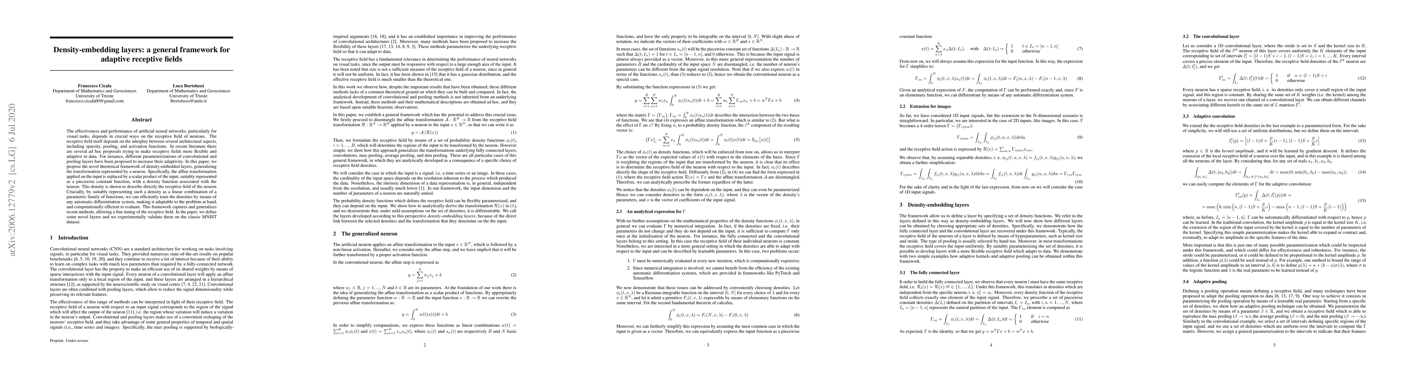 The effectiveness and performance of artificial neural networks, particularly for visual tasks, depends in crucial ways on the receptive field of neurons. The receptive field itself depends on the interplay between several architectural aspects, including sparsity, pooling, and activation functions. In recent literature there are several ad hoc proposals trying to make receptive fields more flexible and adaptive to data. For instance, different parameterizations of convolutional and pooling layers have been proposed to increase their adaptivity. In this paper, we propose the novel theoretical framework of density-embedded layers, generalizing the transformation represented by a neuron. Specifically, the affine transformation applied on the input is replaced by a scalar product of the input, suitably represented as a piecewise constant function, with a density function associated with the neuron. This density is shown to describe directly the receptive field of the neuron. Crucially, by suitably representing such a density as a linear combination of a parametric family of functions, we can efficiently train the densities by means of any automatic differentiation system, making it adaptable to the problem at hand, and computationally efficient to evaluate. This framework captures and generalizes recent methods, allowing a fine tuning of the receptive field. In the paper, we define some novel layers and we experimentally validate them on the classic MNIST dataset.