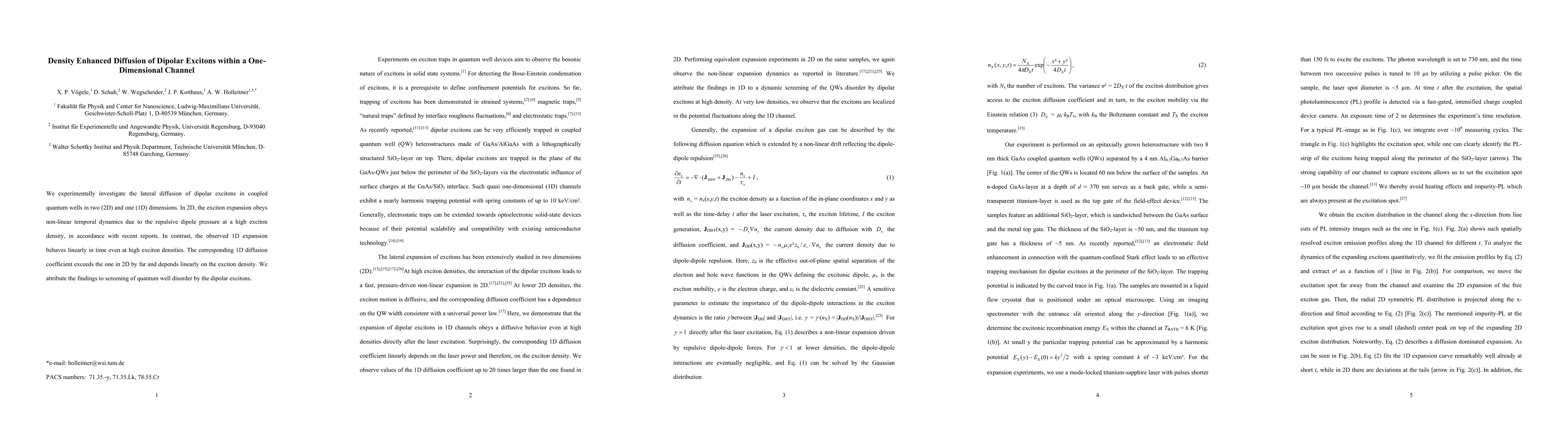 We experimentally investigate the lateral diffusion of dipolar excitons in coupled quantum wells in two (2D) and one (1D) dimensions. In 2D, the exciton expansion obeys non-linear temporal dynamics due to the repulsive dipole pressure at a high exciton density, in accordance with recent reports. In contrast, the observed 1D expansion behaves linearly in time even at high exciton densities. The corresponding 1D diffusion coefficient exceeds the one in 2D by far and depends linearly on the exciton density. We attribute the findings to screening of quantum well disorder by the dipolar excitons.