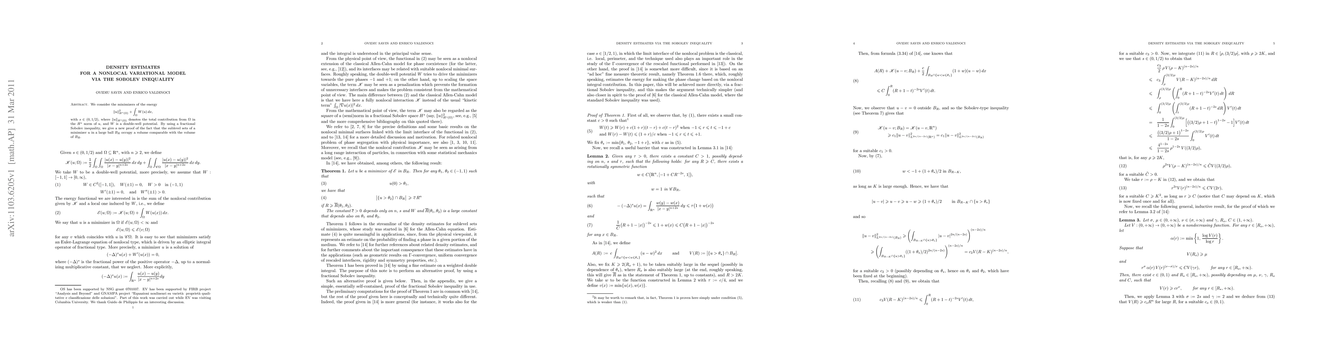 We consider the minimizers of the energy $$ \|u\|_{H^s(\Omega)}^2+\int_\Omega W(u)\,dx,$$ with $s \in (0,1/2)$, where $\|u\|_{H^s(\Omega)}$ denotes the total contribution from $\Omega$ in the $H^s$ norm of $u$, and $W$ is a double-well potential. By using a fractional Sobolev inequality, we give a new proof of the fact that the sublevel sets of a minimizer $u$ in a large ball $B_R$ occupy a volume comparable with the volume of $B_R$.