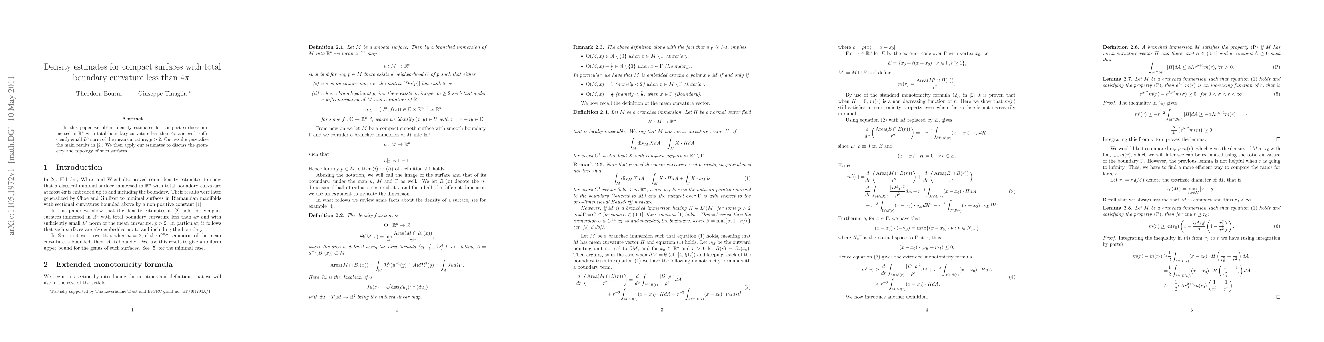 This paper provides density estimates for compact surfaces in R^n with boundary curvature less than 4π and small L^p norm of the mean curvature (p>2). The results generalize previous findings and are applied to explore the geometry and topology of these surfaces.