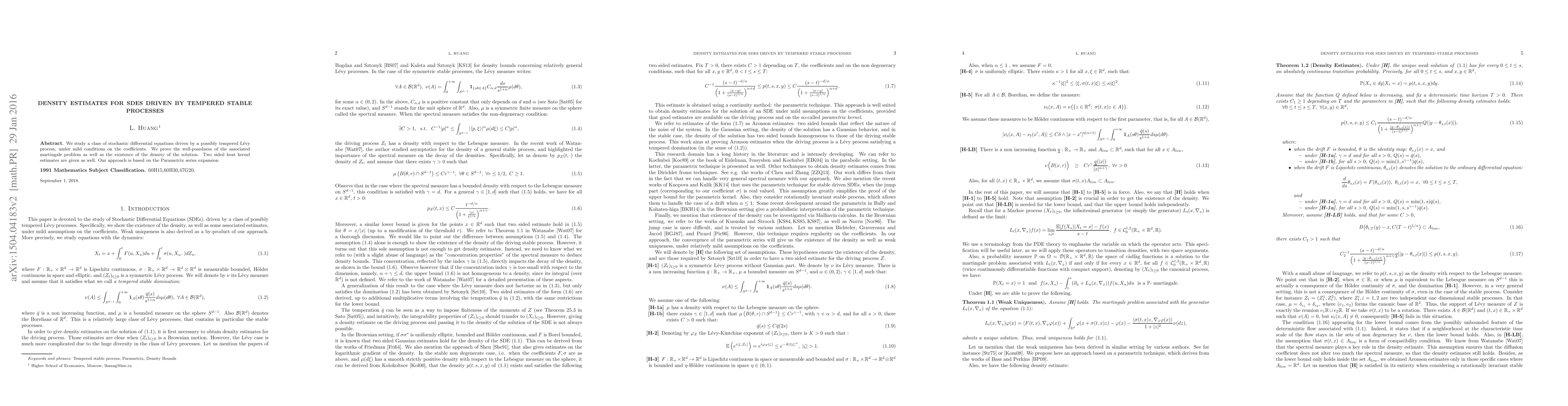 We study a class of stochastic differential equations driven by a possibly tempered L{\'e}vy process, under mild conditions on the coefficients. We prove the well-posedness of the associated martingale problem as well as the existence of the density of the solution. Two sided heat kernel estimates are given as well. Our approach is based on the Parametrix series expansion