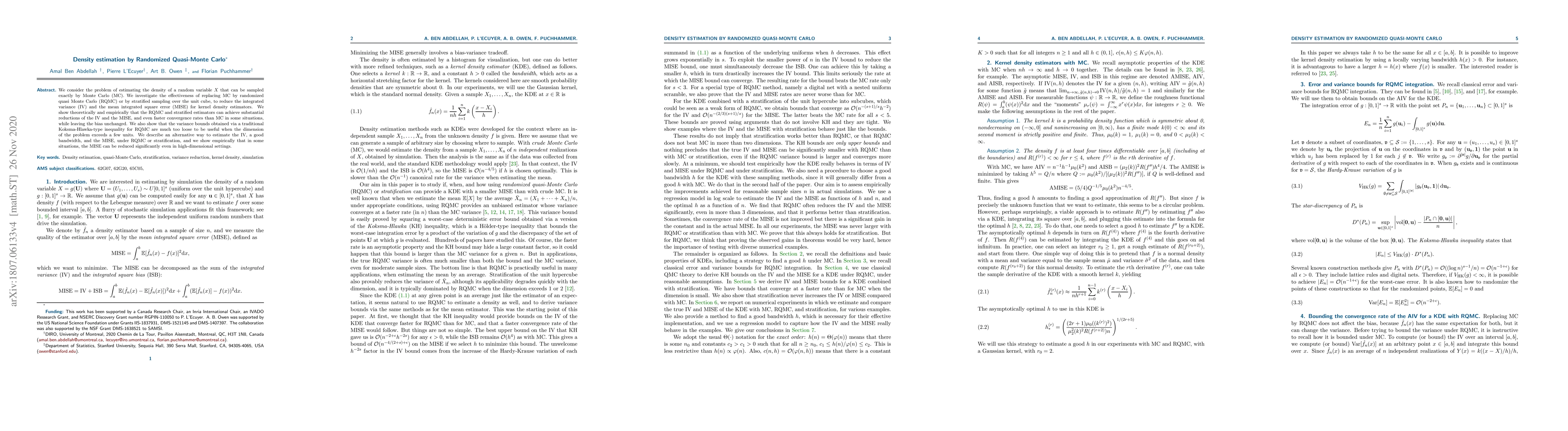 This paper investigates the use of randomized quasi Monte Carlo (RQMC) and stratified sampling to improve density estimation for random variables, showing they can reduce integrated variance and mean integrated square error compared to traditional Monte Carlo methods, while maintaining the same bias. It also proposes a more effective method for estimating variance bounds in high-dimensional settings.