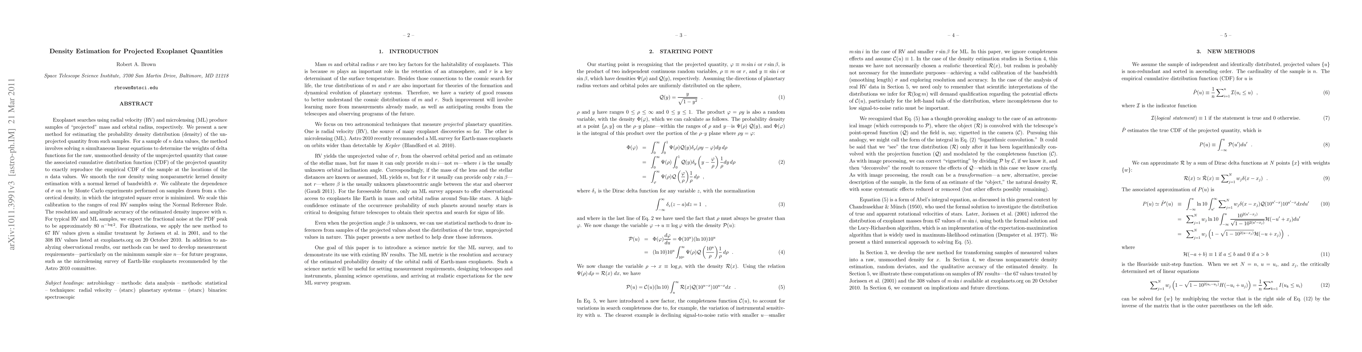 Exoplanet searches using radial velocity (RV) and microlensing (ML) produce samples of "projected" mass and orbital radius, respectively. We present a new method for estimating the probability density distribution (density) of the unprojected quantity from such samples. For a sample of n data values, the method involves solving n simultaneous linear equations to determine the weights of delta functions for the raw, unsmoothed density of the unprojected quantity that cause the associated cumulative distribution function (CDF) of the projected quantity to exactly reproduce the empirical CDF of the sample at the locations of the n data values. We smooth the raw density using nonparametric kernel density estimation with a normal kernel of bandwidth \sigma. We calibrate the dependence of \sigma on n by Monte Carlo experiments performed on samples drawn from a theoretical density, in which the integrated square error is minimized. We scale this calibration to the ranges of real RV samples using the Normal Reference Rule. The resolution and amplitude accuracy of the estimated density improve with n. For typical RV and ML samples, we expect the fractional noise at the PDF peak to be approximately 80 n^{-\log 2}. For illustrations, we apply the new method to 67 RV values given a similar treatment by Jorissen et al. in 2001, and to the 308 RV values listed at exoplanets.org on 20 October 2010. In addition to analyzing observational results, our methods can be used to develop measurement requirements--particularly on the minimum sample size n--for future programs, such as the microlensing survey of Earth-like exoplanets recommended by the Astro 2010 committee.