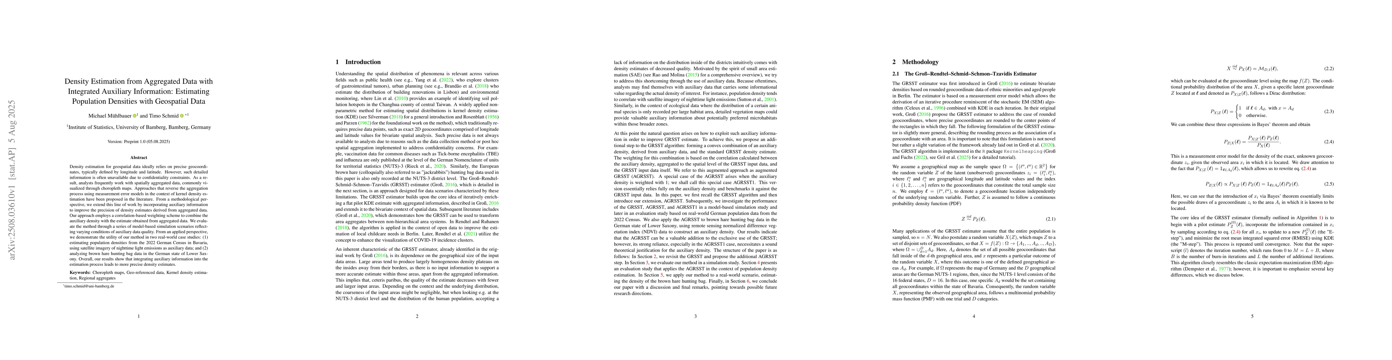 Density estimation for geospatial data ideally relies on precise geocoordinates, typically defined by longitude and latitude. However, such detailed information is often unavailable due to confidentiality constraints. As a result, analysts frequently work with spatially aggregated data, commonly visualized through choropleth maps. Approaches that reverse the aggregation process using measurement error models in the context of kernel density estimation have been proposed in the literature. From a methodological perspective, we extend this line of work by incorporating auxiliary information to improve the precision of density estimates derived from aggregated data. Our approach employs a correlation-based weighting scheme to combine the auxiliary density with the estimate obtained from aggregated data. We evaluate the method through a series of model-based simulation scenarios reflecting varying conditions of auxiliary data quality. From an applied perspective, we demonstrate the utility of our method in two real-world case studies: (1) estimating population densities from the 2022 German Census in Bavaria, using satellite imagery of nighttime light emissions as auxiliary data; and (2) analyzing brown hare hunting bag data in the German state of Lower Saxony. Overall, our results show that integrating auxiliary information into the estimation process leads to more precise density estimates.