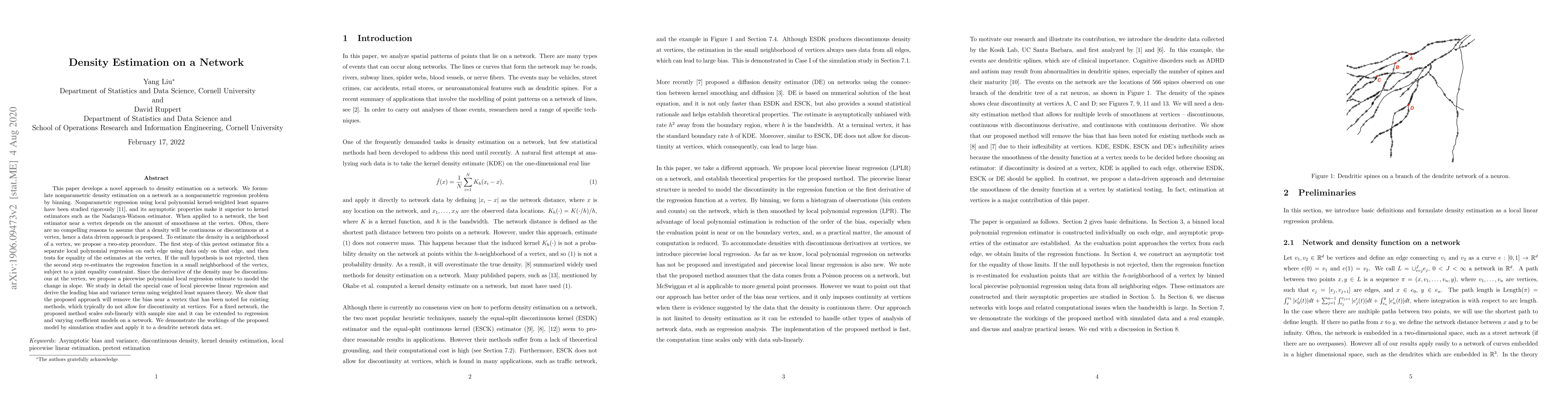This paper develops a novel approach to density estimation on a network. We formulate nonparametric density estimation on a network as a nonparametric regression problem by binning. Nonparametric regression using local polynomial kernel-weighted least squares have been studied rigorously, and its asymptotic properties make it superior to kernel estimators such as the Nadaraya-Watson estimator. When applied to a network, the best estimator near a vertex depends on the amount of smoothness at the vertex. Often, there are no compelling reasons to assume that a density will be continuous or discontinuous at a vertex, hence a data driven approach is proposed. To estimate the density in a neighborhood of a vertex, we propose a two-step procedure. The first step of this pretest estimator fits a separate local polynomial regression on each edge using data only on that edge, and then tests for equality of the estimates at the vertex. If the null hypothesis is not rejected, then the second step re-estimates the regression function in a small neighborhood of the vertex, subject to a joint equality constraint. Since the derivative of the density may be discontinuous at the vertex, we propose a piecewise polynomial local regression estimate to model the change in slope. We study in detail the special case of local piecewise linear regression and derive the leading bias and variance terms using weighted least squares theory. We show that the proposed approach will remove the bias near a vertex that has been noted for existing methods, which typically do not allow for discontinuity at vertices. For a fixed network, the proposed method scales sub-linearly with sample size and it can be extended to regression and varying coefficient models on a network. We demonstrate the workings of the proposed model by simulation studies and apply it to a dendrite network data set.