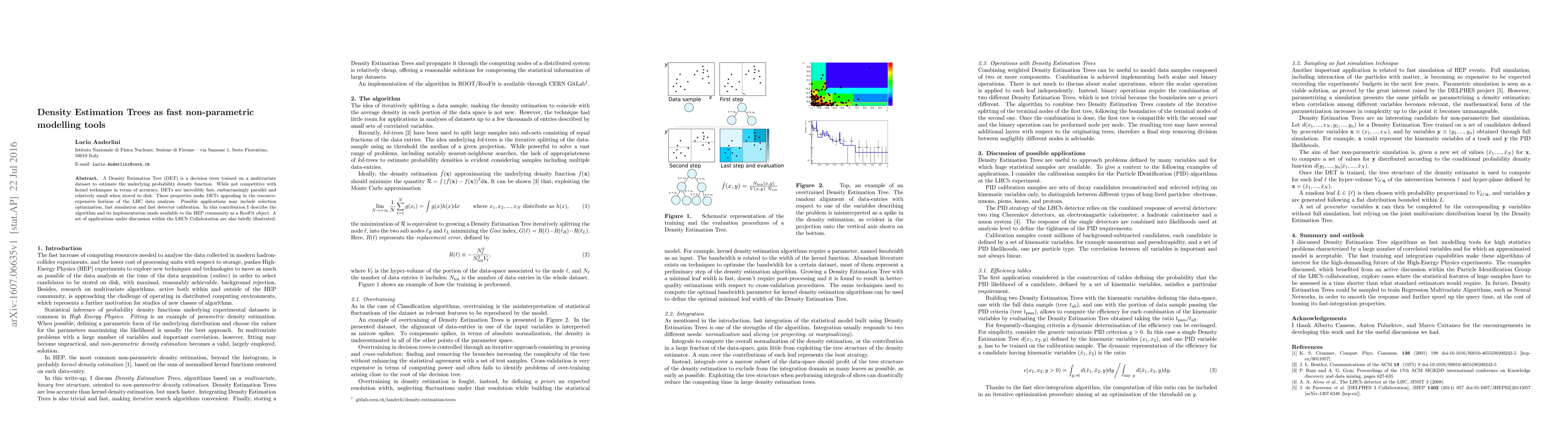 Density Estimation Trees (DETs) are decision trees used for fast, non-parametric density function estimation, offering speed, parallelism, and small storage size. They are proposed for resource-intensive LHC data analysis tasks like selection optimization, fast simulation, and detector calibration, with a RooFit implementation available and potential applications in LHCb Collaboration.