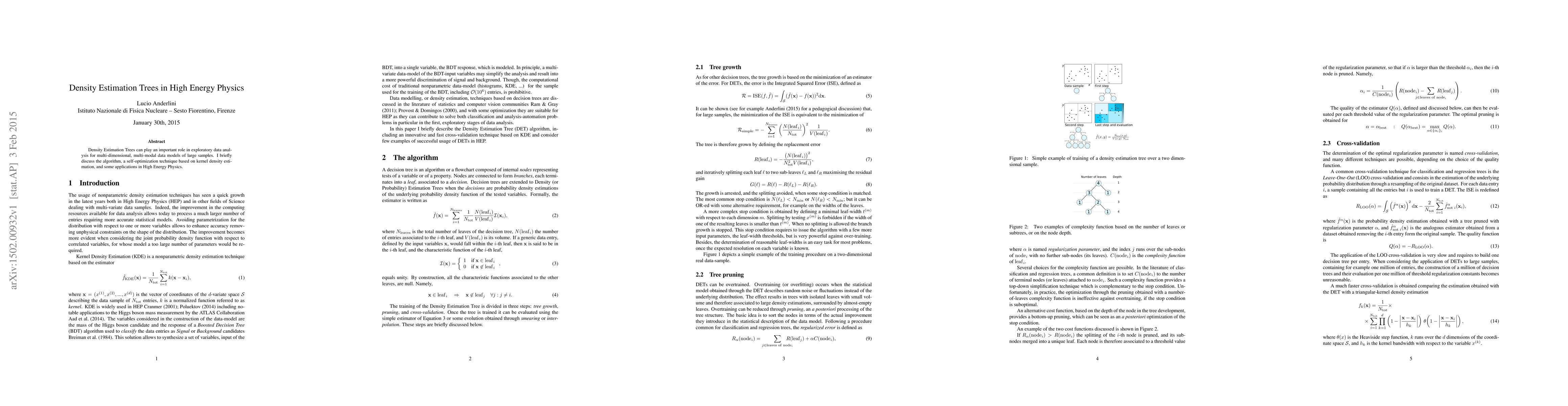Density Estimation Trees can play an important role in exploratory data analysis for multidimensional, multi-modal data models of large samples. I briefly discuss the algorithm, a self-optimization technique based on kernel density estimation, and some applications in High Energy Physics.