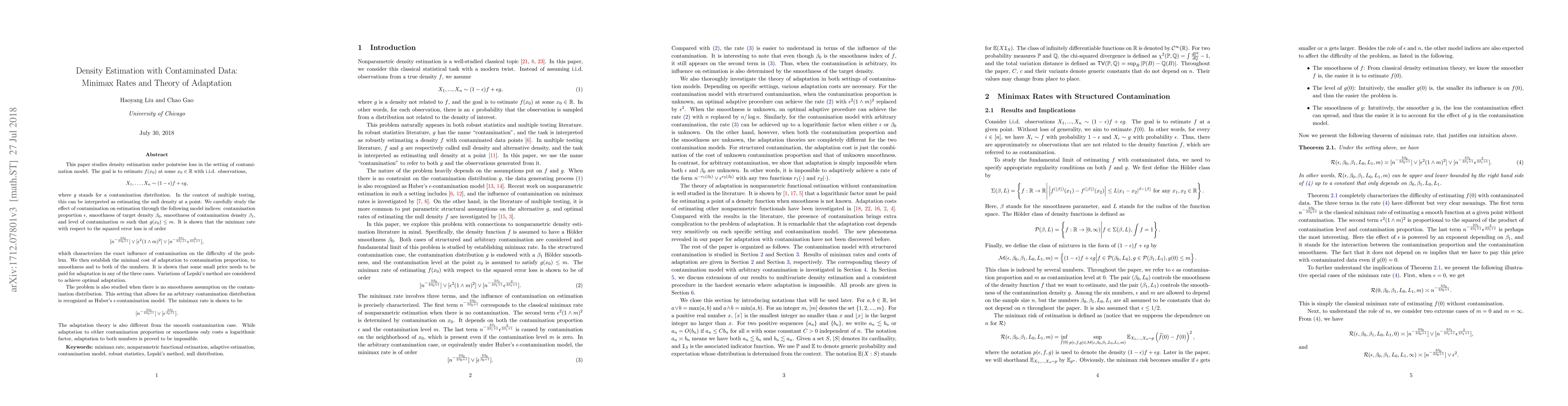 This paper studies density estimation with contaminated data, finding that contamination affects estimation difficulty and establishing minimax rates and adaptation theory for different model parameters.