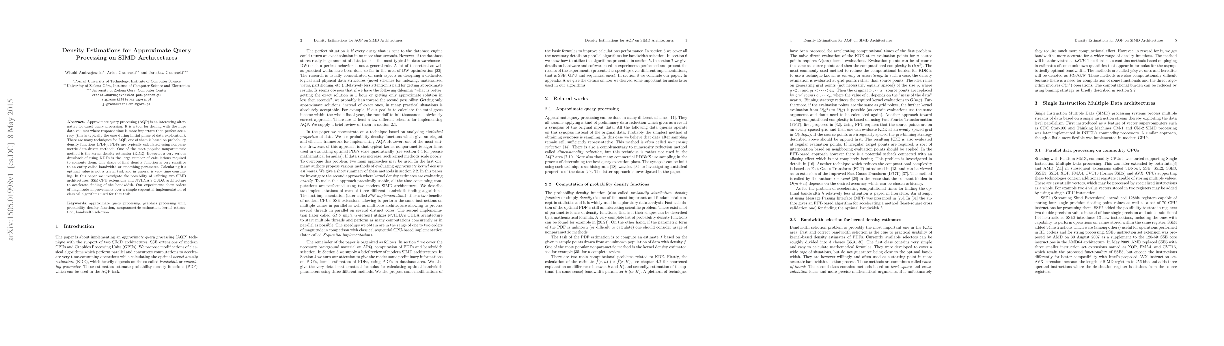 Approximate query processing (AQP) is an interesting alternative for exact query processing. It is a tool for dealing with the huge data volumes where response time is more important than perfect accuracy (this is typically the case during initial phase of data exploration). There are many techniques for AQP, one of them is based on probability density functions (PDF). PDFs are typically calculated using nonparametric data-driven methods. One of the most popular nonparametric method is the kernel density estimator (KDE). However, a very serious drawback of using KDEs is the large number of calculations required to compute them. The shape of final density function is very sensitive to an entity called bandwidth or smoothing parameter. Calculating it's optimal value is not a trivial task and in general is very time consuming. In this paper we investigate the possibility of utilizing two SIMD architectures: SSE CPU extensions and NVIDIA's CUDA architecture to accelerate finding of the bandwidth. Our experiments show orders of magnitude improvements over a simple sequential implementation of classical algorithms used for that task.