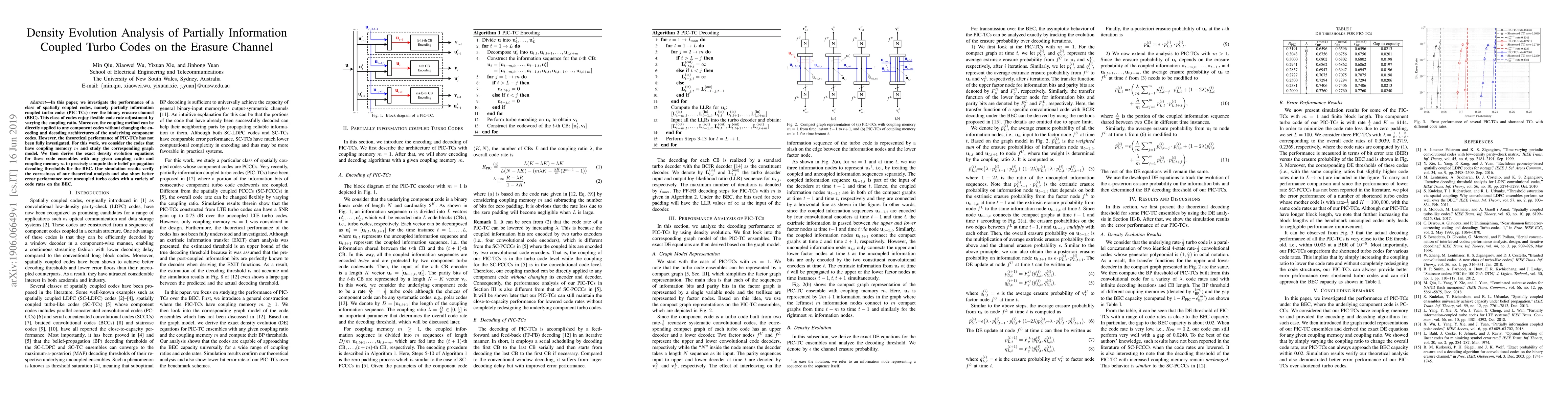 This paper develops density evolution equations to analyze the performance of partially information coupled turbo codes (PIC-TCs) over the binary erasure channel. It shows these codes outperform uncoupled turbo codes across different code rates, demonstrating the effectiveness of the coupling method.
