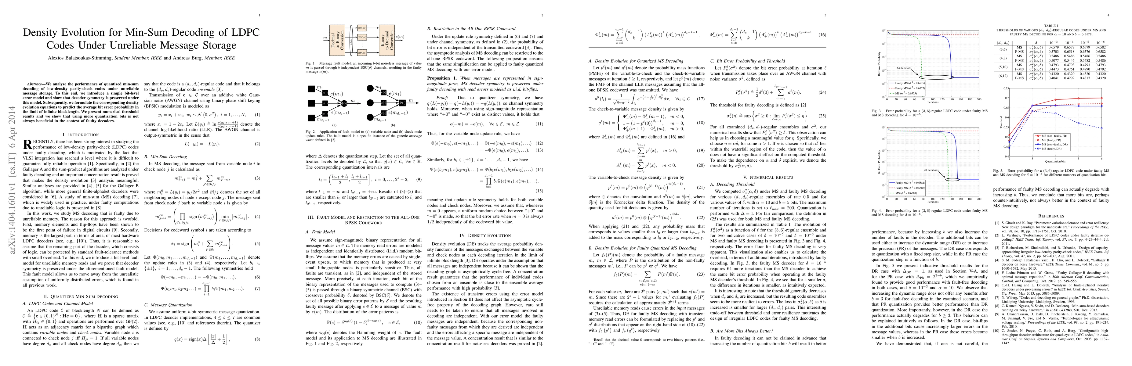 This research analyzes the performance of quantized min-sum decoding of LDPC codes with unreliable message storage, preserving decoder symmetry via a bit-level error model. It formulates density evolution equations to predict bit error probabilities, presenting threshold results and showing that increased quantization bits don't always improve faulty decoder performance.