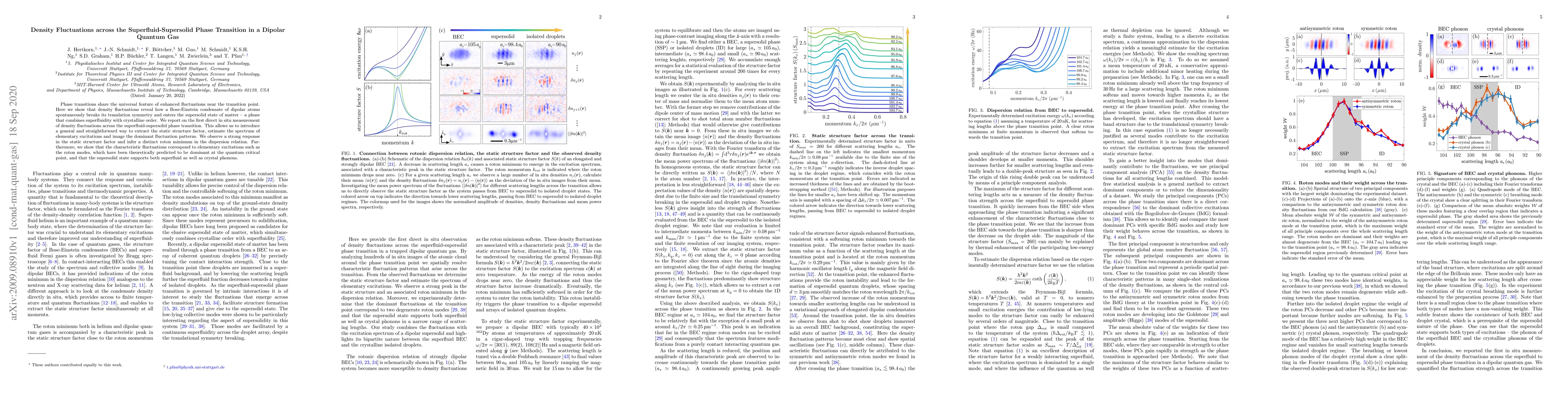 This research investigates density fluctuations in a dipolar Bose-Einstein condensate undergoing a superfluid-supersolid phase transition, revealing spontaneous symmetry breaking and the emergence of supersolidity. The study provides the first direct measurement of these fluctuations, allowing for the extraction of the static structure factor and identification of roton modes, confirming theoretical predictions of dominant excitations at the quantum critical point.