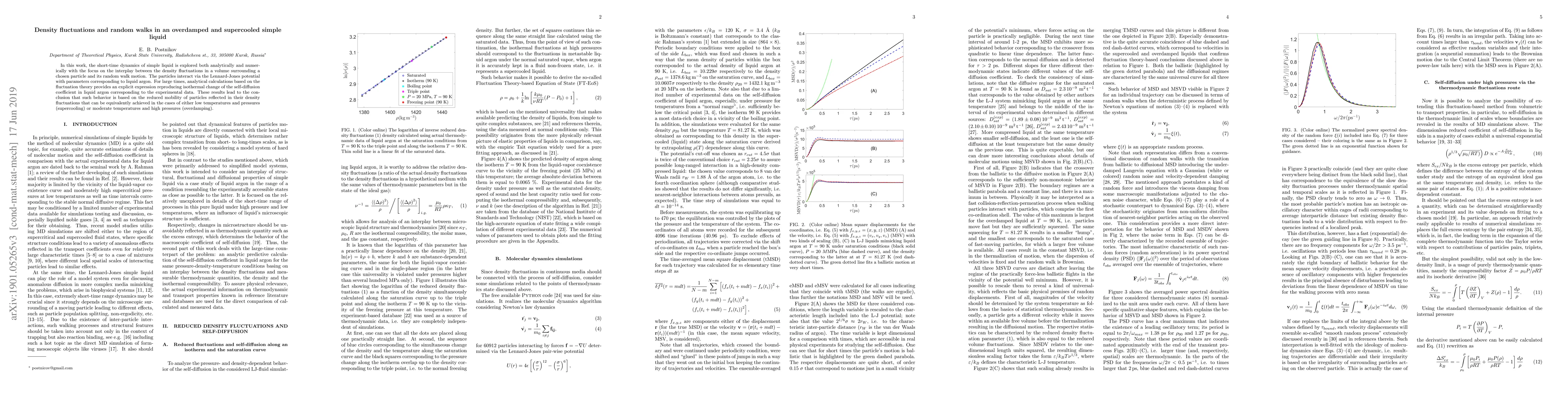 In this work, the short-time dynamics of simple liquid is explored both analytically and numerically with the focus on the interplay between the density fluctuations in a volume surrounding a chosen particle and its random walk motion. The particles interact via the Lennard-Jones potential with parameters corresponding to liquid argon. For large times, analytical calculations based on the fluctuation theory provides an explicit expression reproducing isothermal change of the self-diffusion coefficient in liquid argon corresponding to the experimental data. These results lead to the conclusion that such behavior is based on the reduced mobility of particles reflected in their density fluctuations that can be equivalently achieved in the cases of either low temperatures and pressures (supercooling) or moderate temperatures and high pressures (overdamping).