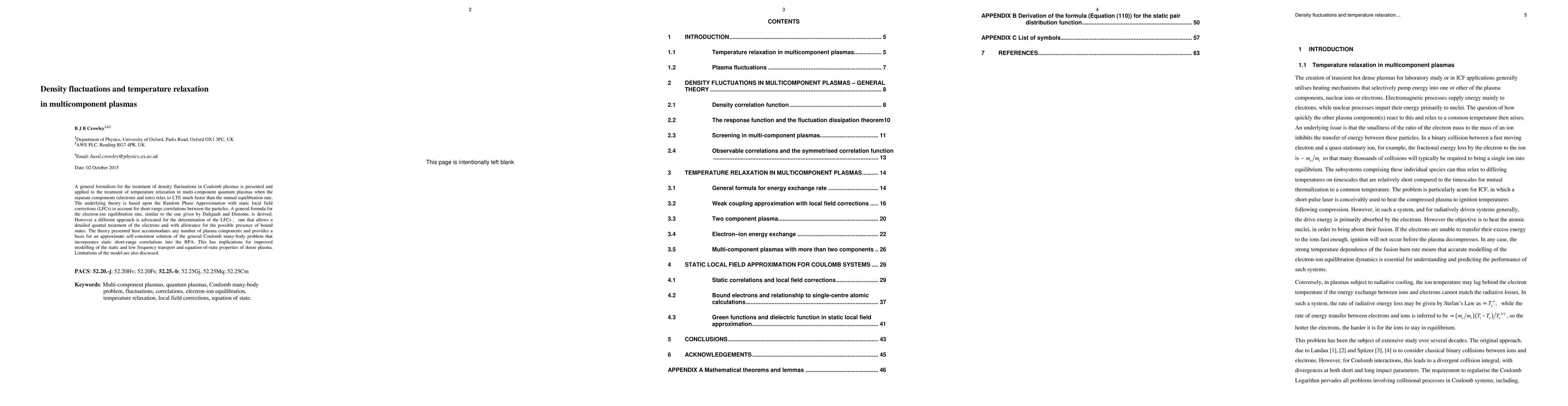 This paper develops a formalism for density fluctuations in multicomponent plasmas using Random Phase Approximation with static local field corrections, and applies it to temperature relaxation in quantum plasmas. The approach allows for detailed quantal treatment of electrons and bound states, providing a basis for improved modelling of dense plasmas' transport and equation-of-state properties.