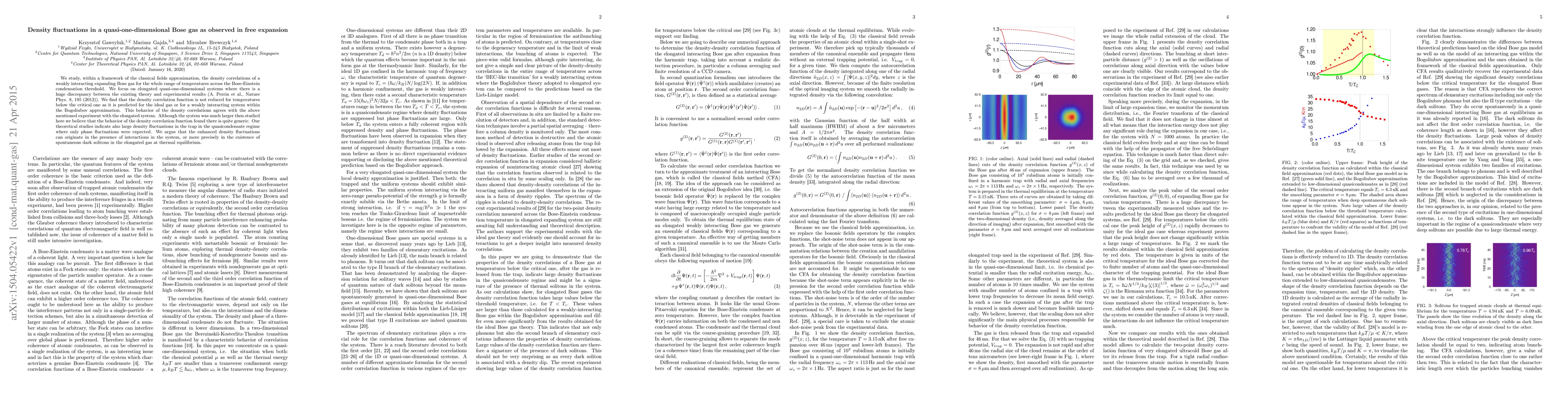 This paper investigates density correlations in a quasi-one-dimensional Bose gas during free expansion, revealing that density fluctuations persist below the Bose-Einstein condensation threshold contrary to theoretical predictions. The findings align with experimental observations and suggest that interactions, specifically spontaneous dark solitons, enhance these fluctuations.